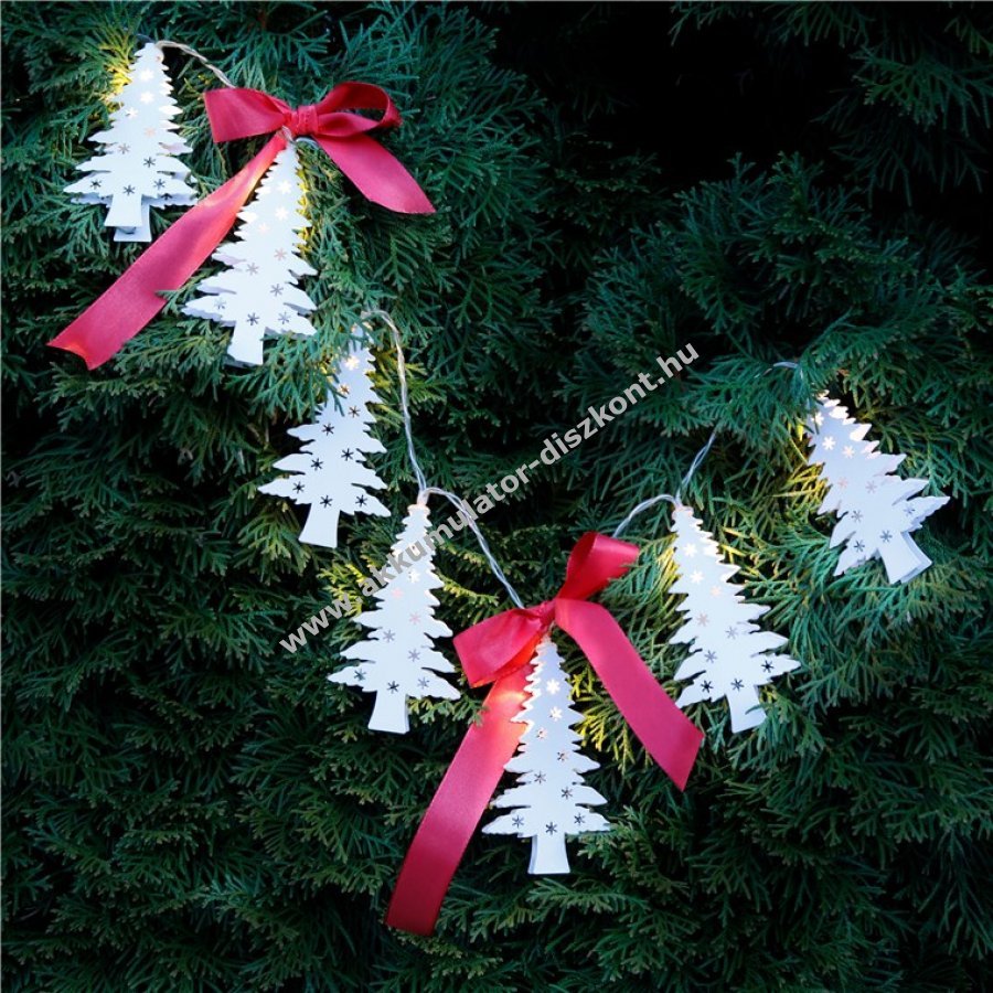Elemes LED fényfüzér időzítő funkcióval 6 óra bekapcsolt 18 óra kikapcsolt időszakokkal 3 állású kapcsolóval BE/KI/Időzítő 130 cm teljes hosszúság 40 cm tápkábel 10 cm LED távolság átlátszó kábel 2x AA (ceruzaelem) működteti nem tartozék IP20 beltéri használatra fém fehér mini karácsonyfa alakú medálokkal minden világítóelemhez alkalmas karácsonyi és téli dekorációhoz kellemes fényt és ünnepi hangulatot teremt