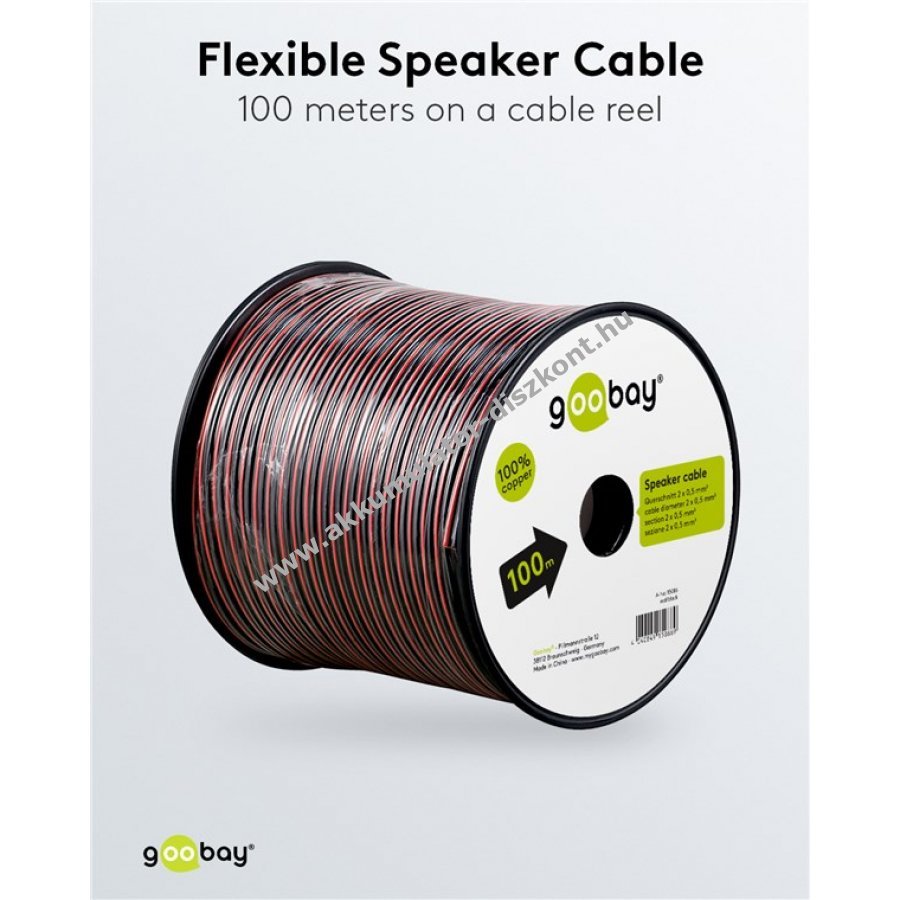 A Goobay hangszórókábel kiváló minőségű réz sodrott vezetékkel (OFC) biztosítja a hangjelek tiszta átvitelét Hi-Fi rendszerek, erősítők és hangfalak között. A két színű vezeték segíti a helyes polaritás betartását és egyszerű szerelést. A rugalmas és strapabíró PVC köpeny könnyű hajlíthatóságot és elhelyezést tesz lehetővé.
