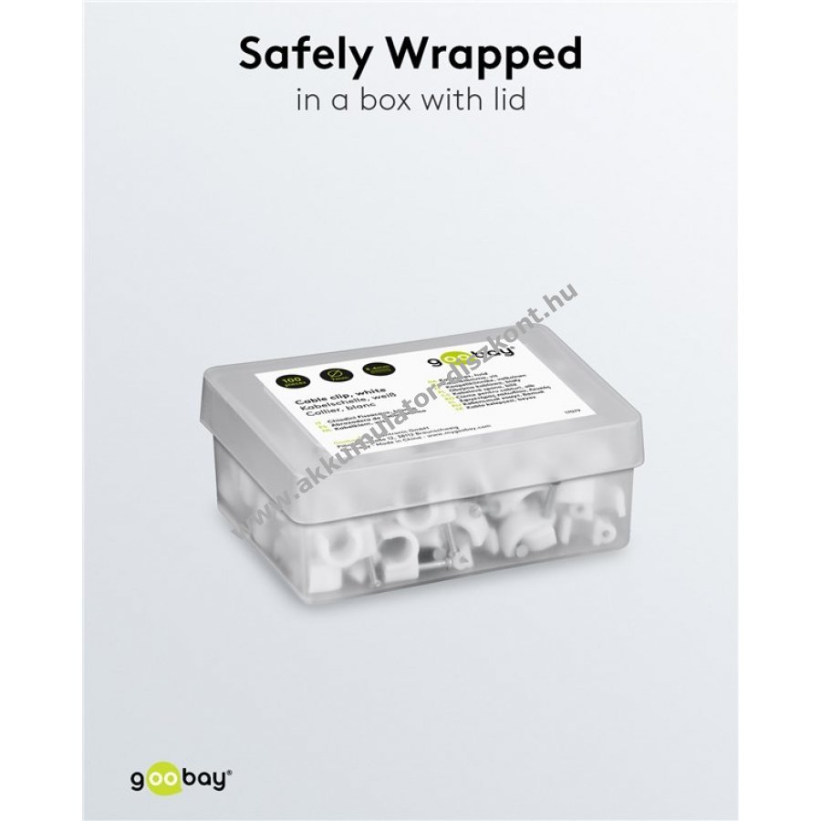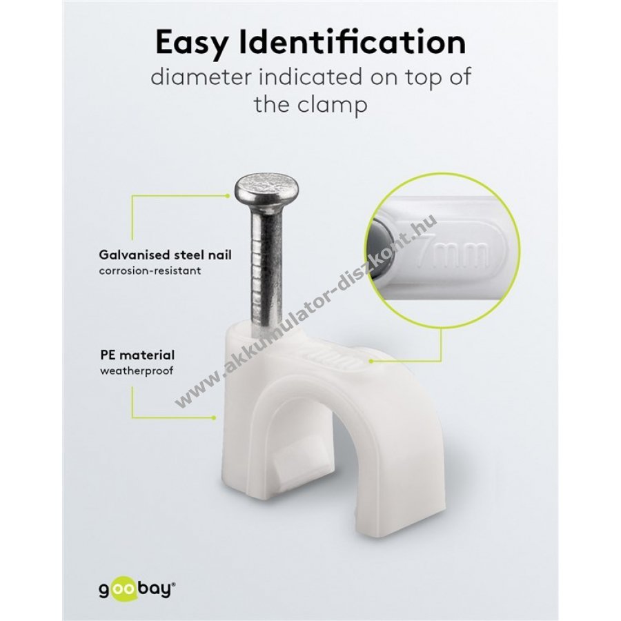 Kábelrendező bilincs kábelek rögzítéséhez falon ajtókereten és sarkokban. Stabilizált PE műanyagból és cinkezett acél szeggel készült. Beltéri és kültéri használatra egyaránt alkalmas jó szigeteléssel korrózió- és öregedésálló.