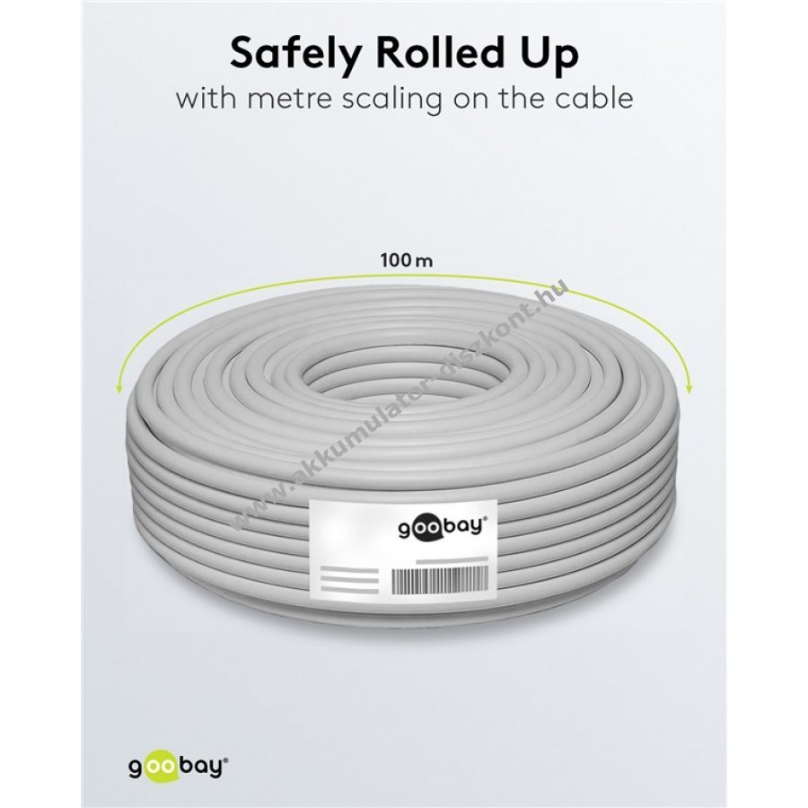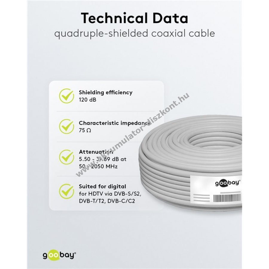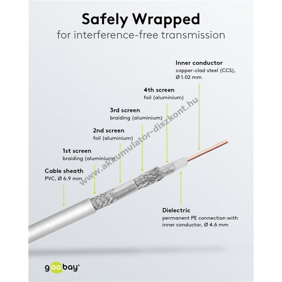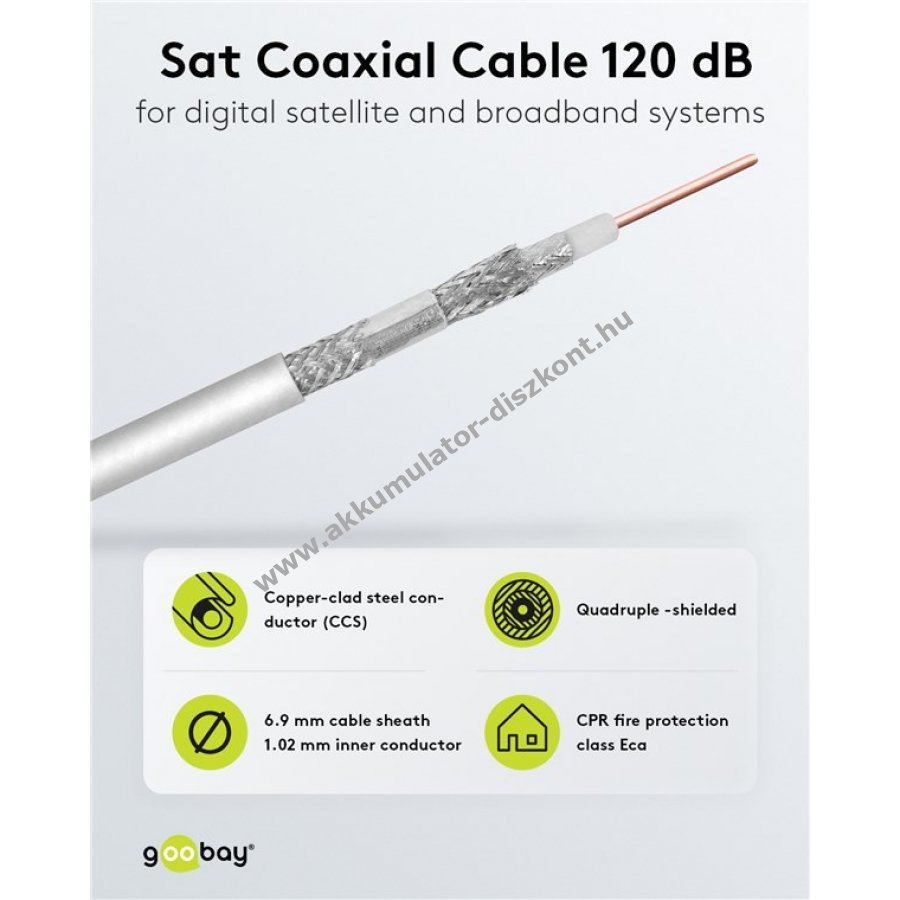 4-szeresen árnyékolt SAT koaxiális kábel CCS vezetővel, alkalmas digitális HDTV-átvitelhez (DVB-S/S2, DVB-T/T2, DVB-C/C2). 120dB árnyékolás és méterskála az antennakábelen. A kábel megfelel a CPR (BauPVO) előírásoknak, Eca tűzvédelmi osztály.