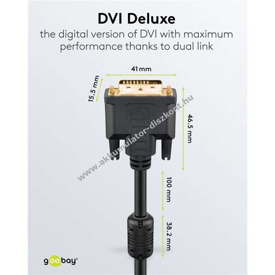 Goobay DVI-D kábel PC és monitor közötti digitális képátvitelhez. Magas felbontású jelátvitel Full HD 1080p és akár WQXGA 2560 x 1600 felbontásig. Aranyozott DVI-D csatlakozók a minimális átvitel ellenállásért. Ferritmag a zavaró jelek csökkentésére. Masszív kivitel és minőségi anyagok a pontos színvisszaadásért.