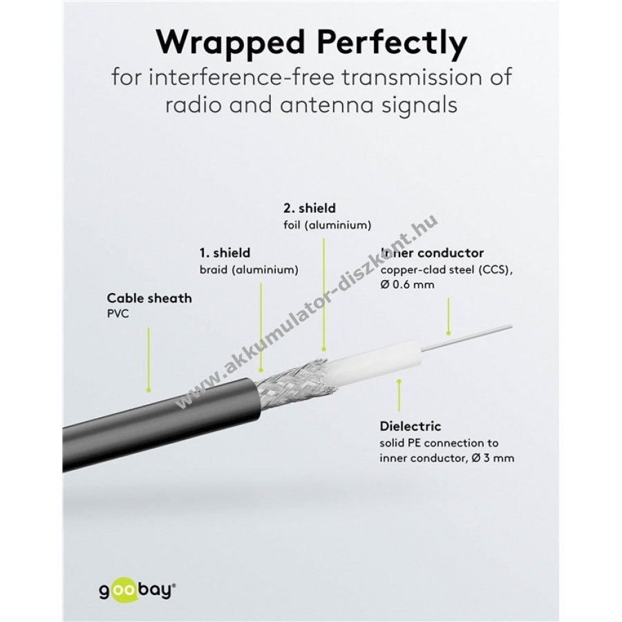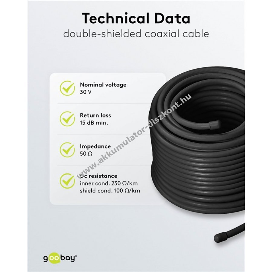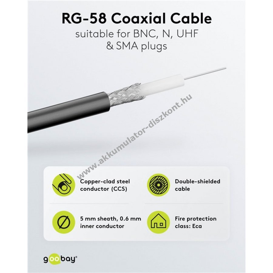 Rugalmas RG-58 koax kábel 50? impedanciával, vékony 5mm kivitelben, dupla árnyékolással a zavartalan jelátvitelért. Belső vezető:0,6mm rézbevonatos acél. SAT-kábel, CPR megfelelőség (Eca tűzvédelmi osztály).