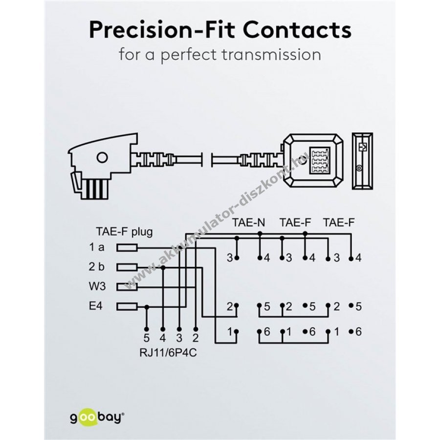 A Goobay telefonkábelek kiváló minőségű jelet továbbítanak és stabil kapcsolatot biztosítanak. Minőségi belső vezetők, masszív kábelburkolat és pontosan illeszkedő csatlakozók jellemzik a terméket. TAE adapter modemet routert faxot és telefont csatlakoztat TAE aljzathoz. Ideális megoldás TAE kábel hosszabbításához TAE-N vagy TAE-F csatlakozóval. TAE-N F F aljzatok és RJ11 RJ14 aljzat különböző kábel típusokhoz. 1x TAE-F csatlakozó hajlításgátlóval és minőségi érintkezőkkel a zavartalan jelátvitelért. Kábel rézbevonatos alumínium vezetővel a tiszta jelminőségért. Tartós PVC burkolat védi a kábelt a sérülésektől.