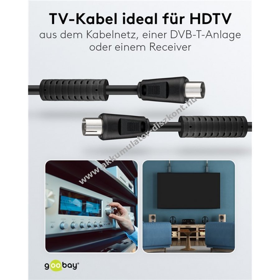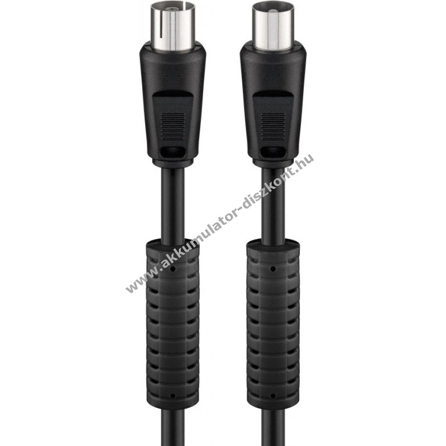 Kettős árnyékolású műholdas antennakábel a zavartalan jelátvitelhez. Mindkét oldalon öntött csatlakozó a por, szennyeződés és mechanikai terhelés elleni védelemhez, nikkelezett, pontos érintkezők és manteláram-szűrő a zavarok csökkentésére. Hossza 2,5m.