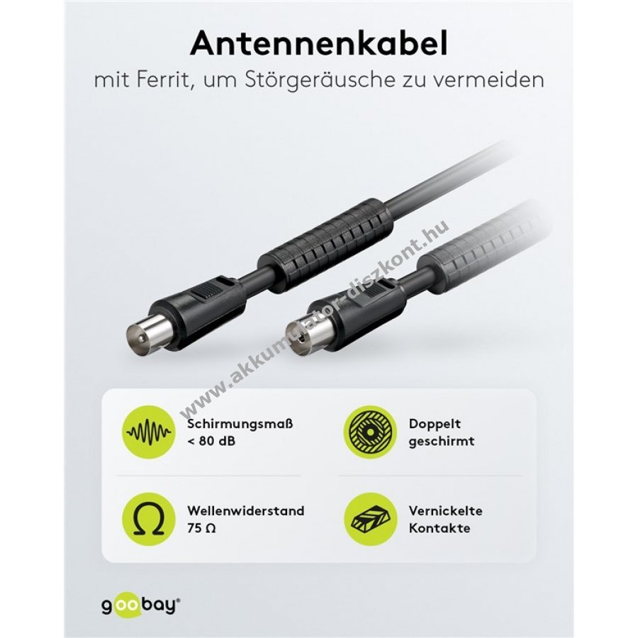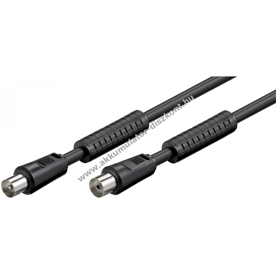 Dupla árnyékolású 5m Goobay koaxiális antennakábel beépített ferritgyűrűvel a zavarok csökkentésére mindkét végén öntött, por- és mechanikai védelemmel ellátott koax csatlakozó.