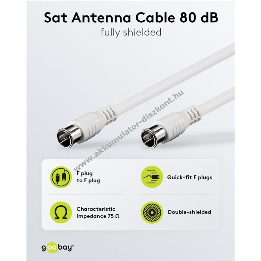 Dupla árnyékolású SAT koaxiális kábel a zavarmentes jelátvitelhez. 80dB árnyékolási hatékonyság, 2.5m hossz.