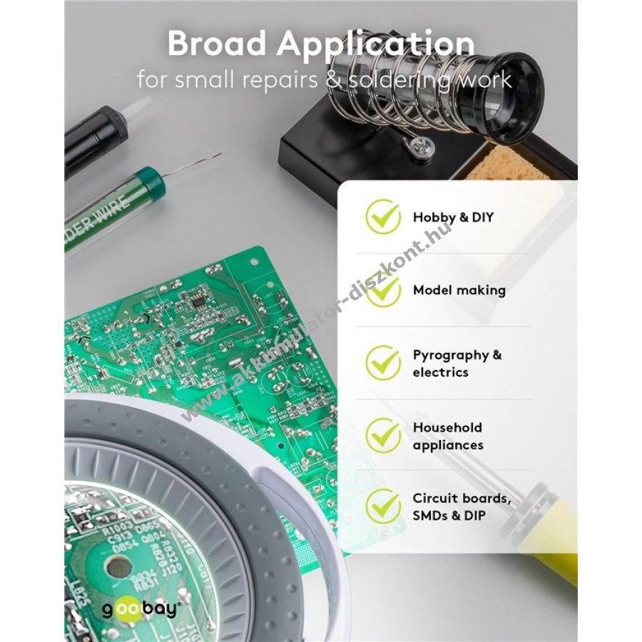 Kompakt forrasztókészlet hobbi felhasználásra különböző forrasztási munkákhoz, például NYÁK-ok, SMD és DIP alkatrészek, valamint elektromos készülékek javításához
