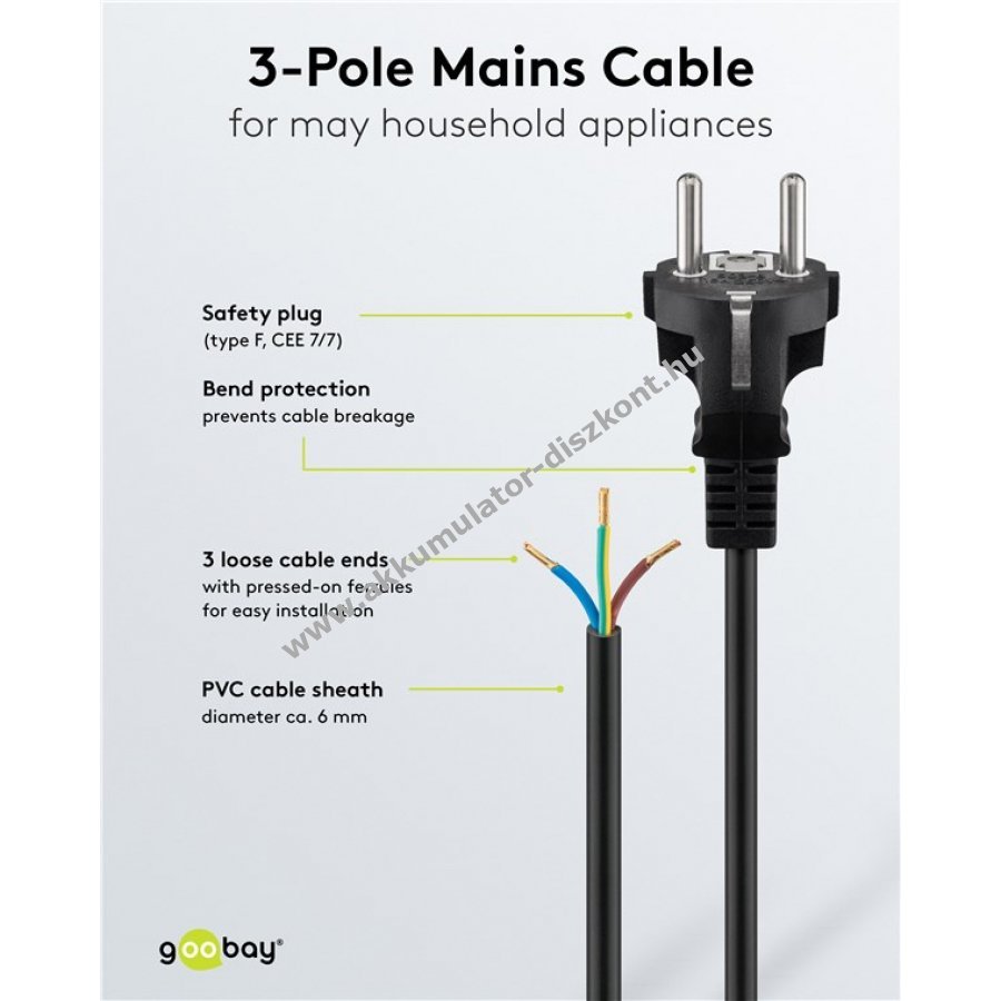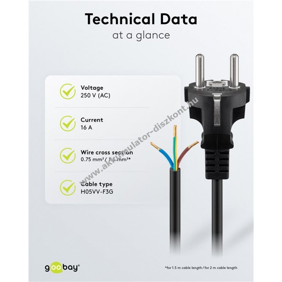 Goobay védőérintkezős kábel 1,5m fekete 3x0,75 mm2 CEE 7/7 csatlakozóval
