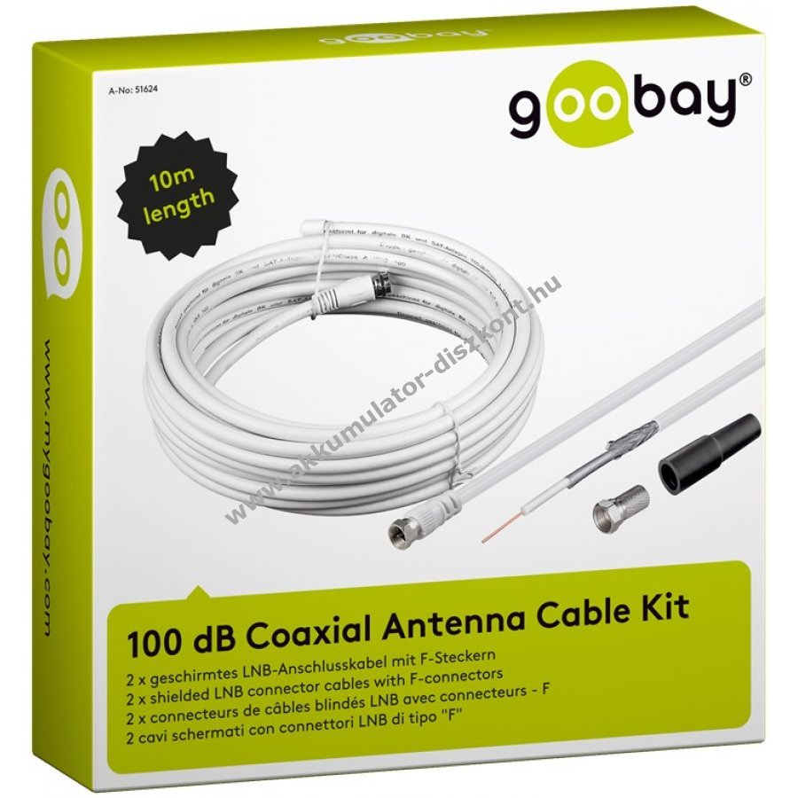 Goobay 10m hosszú koaxiális antennakábel szett, különösen single-LNB közvetlen csatlakoztatására alkalmas egyoldali szabad kábelvégekkel a könnyített szereléshez és falátvezetéshez, dupla árnyékolással a zavartalan jelátvitelért.