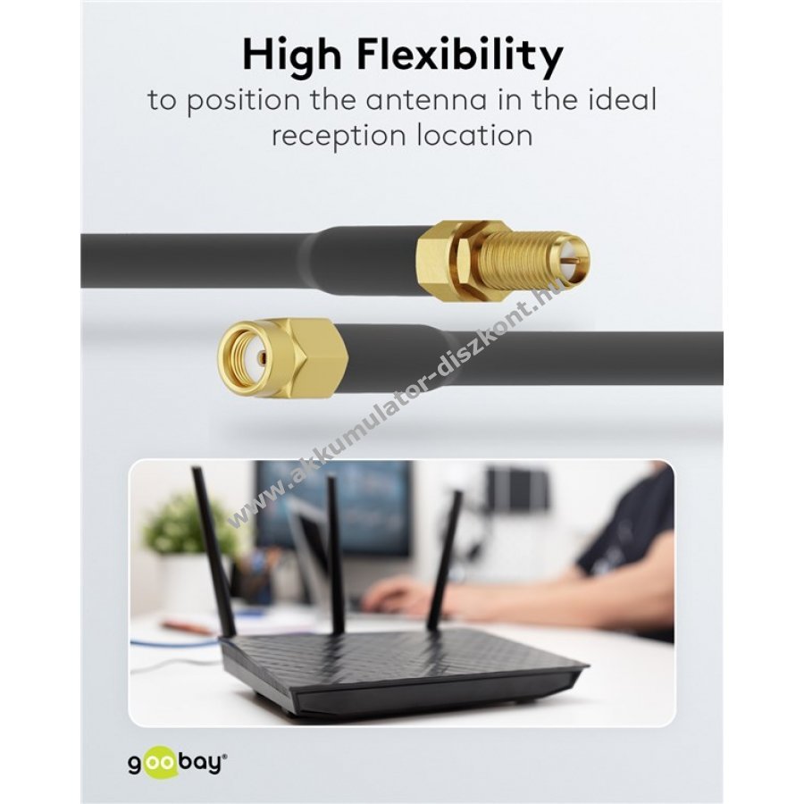 Ez a 2 m hosszú kábel ideális minden RP-SMA csatlakozós WLAN routerhez és antennához.