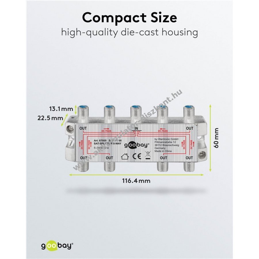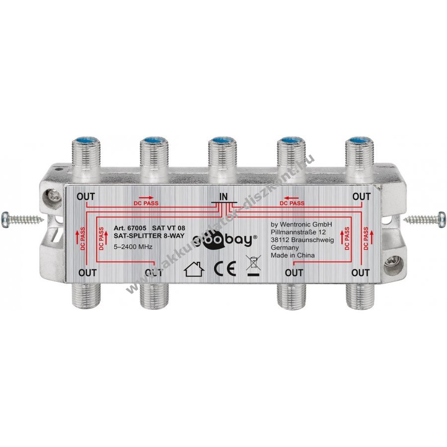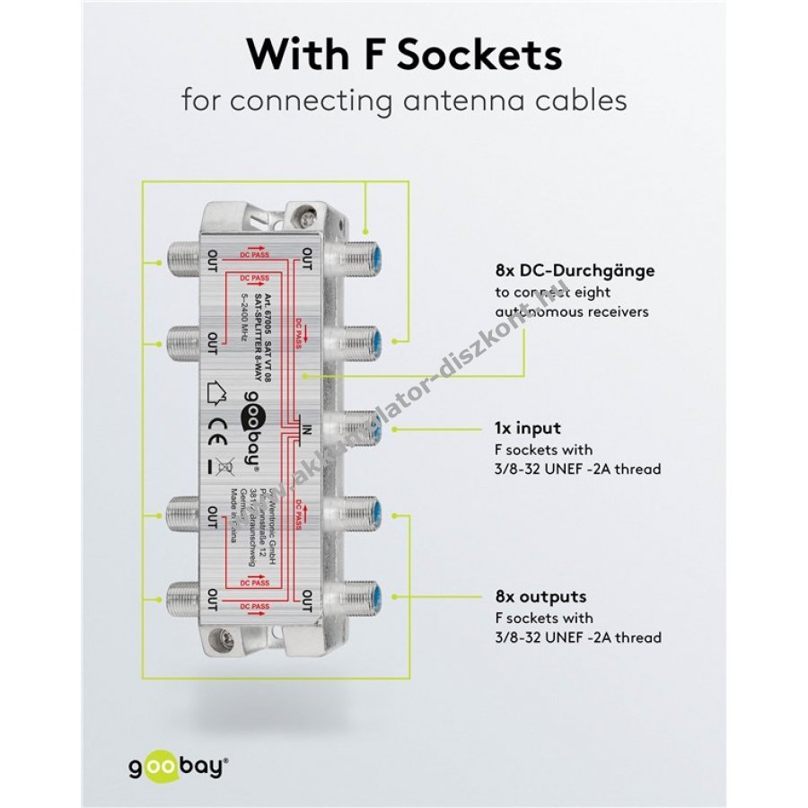 Satellitjel elosztása 8 csatlakozóra fém F-kupplókkal Digitális jelekhez 100 dB árnyékolás Minden csatlakozón DC átvezetés Diodás leválasztás 1750 MHz-en 15 dB elosztási csillapítás 1750 MHz-en 14 dB visszacsatolási csillapítás