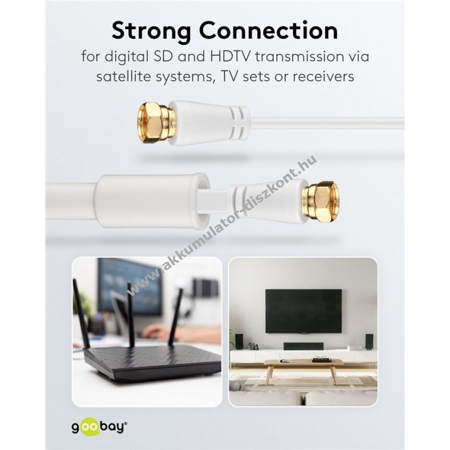 Dupla árnyékolású, lapos SAT antennakábel időjárásálló védőhüvellyel és aranyozott F-F csatlakozókkal a megbízható jelátvitelhez.