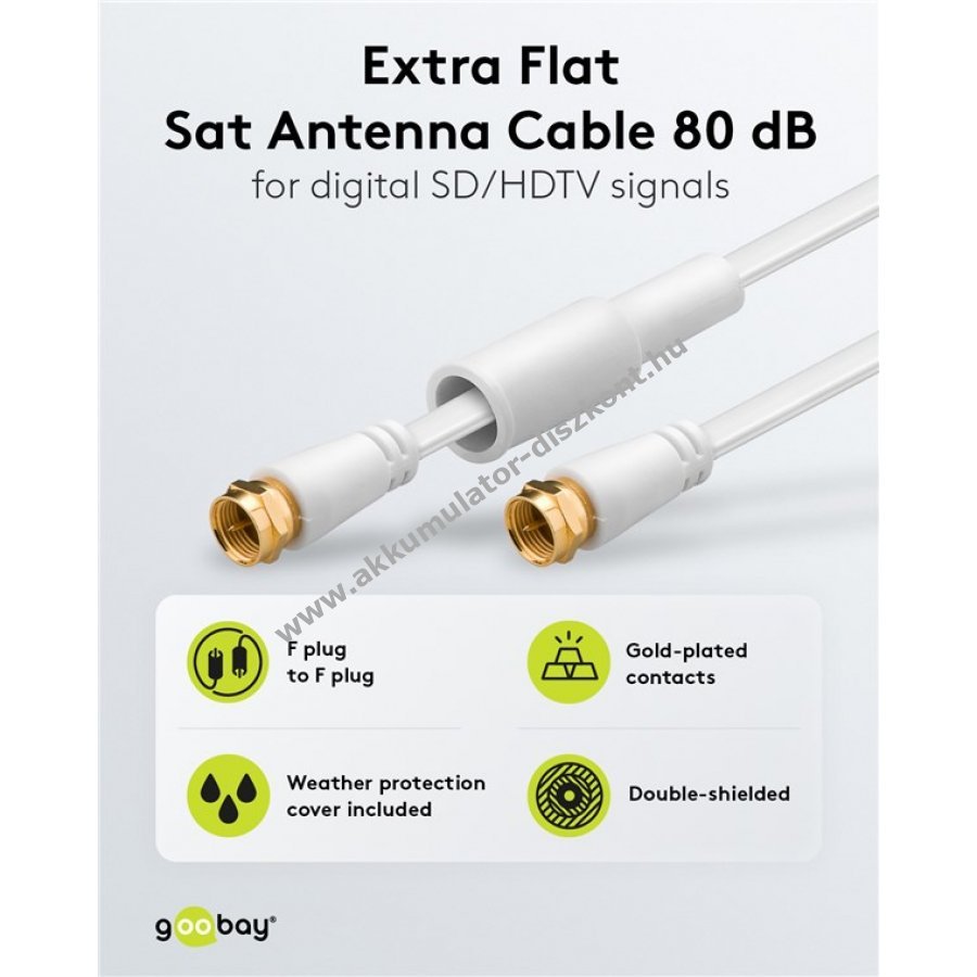 Lapos, dupla árnyékolású SAT antennakábel, amely zavartalan jeltovábbítást biztosít időjárásálló védőhüvelye megóvja a csatlakozókat a porral, szennyeződéssel és mechanikai terheléssel szemben.