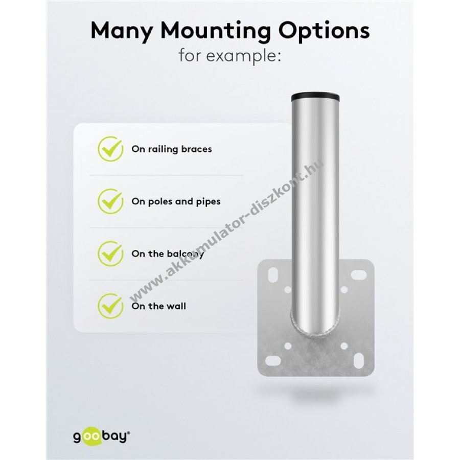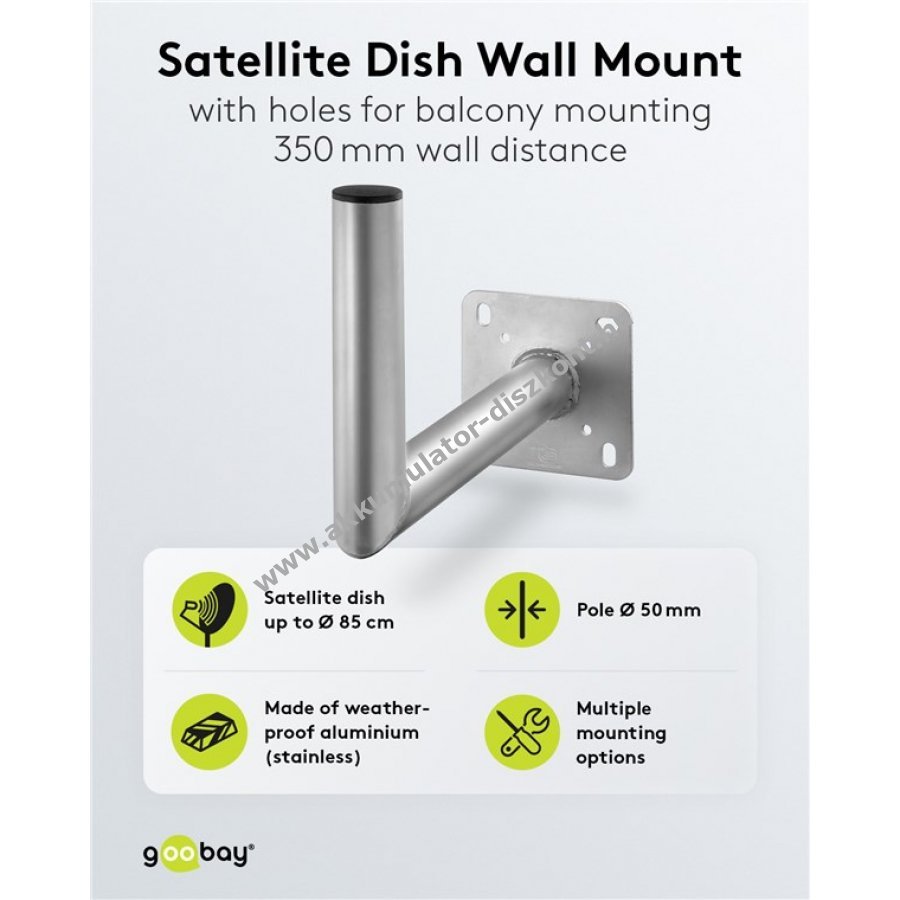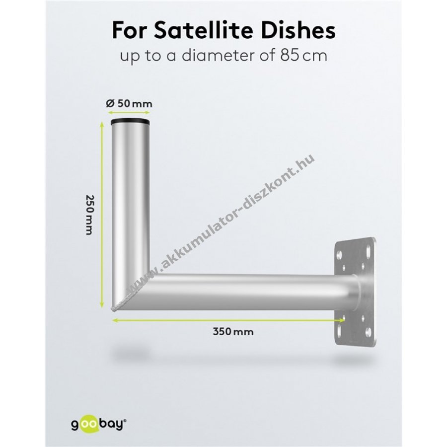 Rozsdamentes és időjárásálló alumíniumból készült falitartó műholdantennákhoz 35 cm és 85 cm közötti átmérővel. 110 mm-es lyuktávolságú hosszúkás nyílások a rugalmas kültéri felszereléshez. 70 mm-es lyuktávolságú extra furatok U típusú csőbilincsek rögzítéséhez erkélykorláton vagy függőleges csöveken. A szerelőlemez mérete kb. 150 mm x 150 mm x 4 mm magas, függőleges magasság 250 mm, csőátmérő 50 mm, anyagvastagság 2 mm.