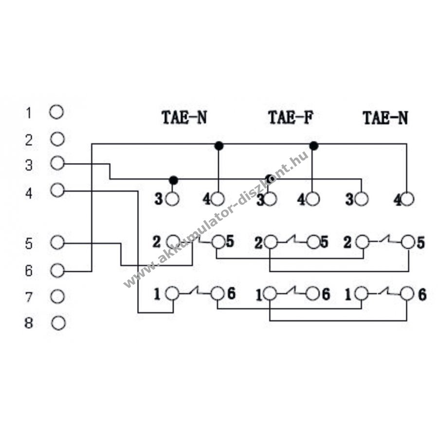 Egy RJ45 csatlakozó aljzathoz csatlakoztatható TAE adapter 1x F aljzattal az telefon vagy router számára és 2x N aljzattal mellékeszközök, például üzenetrögzítő, fax, modem vagy díjjelző csatlakoztatásához.