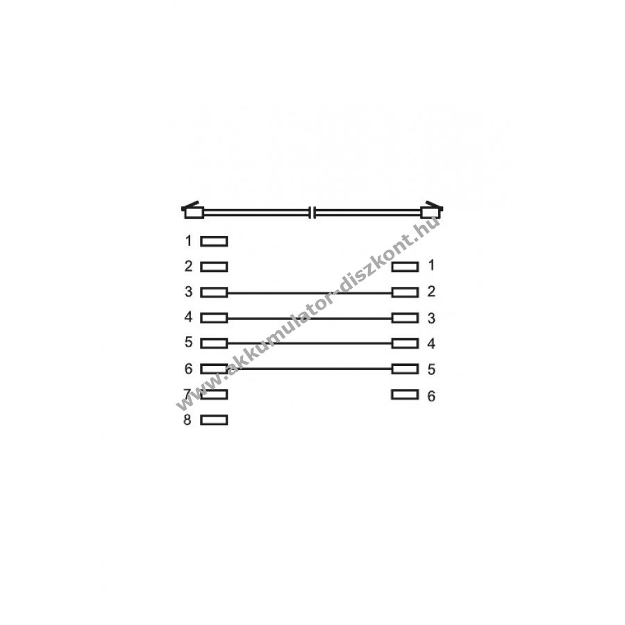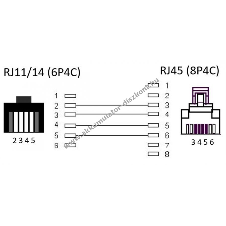 Egyik végén RJ45 moduláris csatlakozó 8P4C, másik végén RJ11 csatlakozó 6P4C reteszelővel és aranyozott érintkezőkkel.