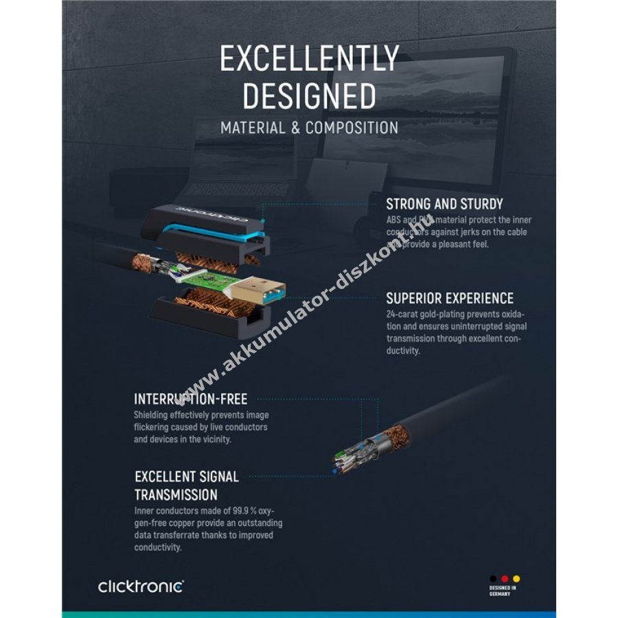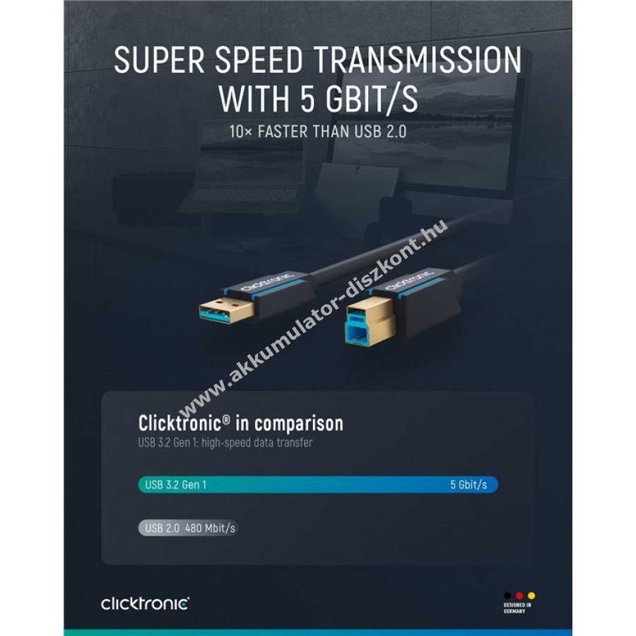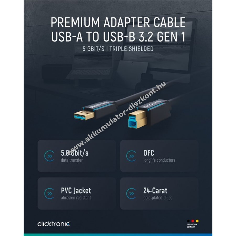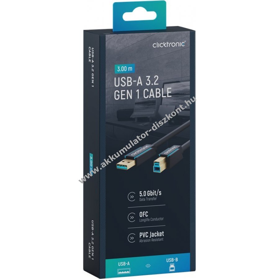 A Clicktronic USB-A USB-B 3.0 adapterkábel tartós és stabil csatlakozást biztosít. 10 év garancia a minőségre. A háromrészes PVC és ABS csatlakozó kialakítás csökkenti a kábel sérülését rángatás esetén. 24 karátos aranyozott fém érintkezők és tiszta réz vezetők gyors adatátvitelt garantálnak. Strapabíró PVC burkolat védi a kábelt és biztosítja a hosszú távú stabil kapcsolatot.