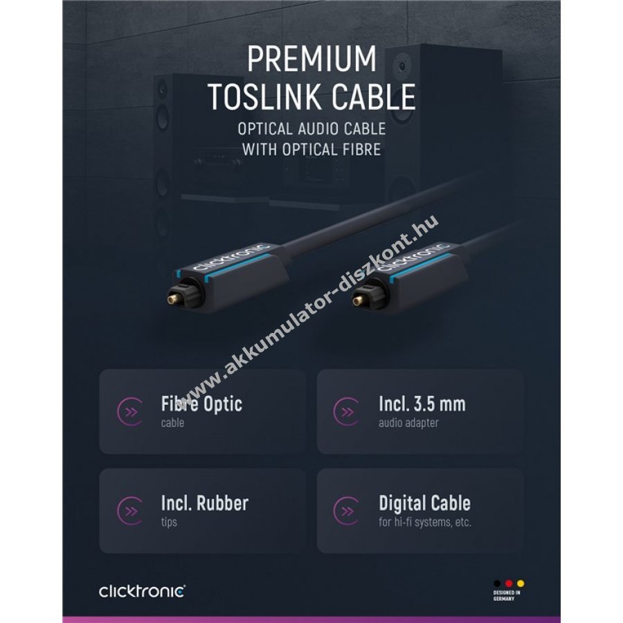 A Clicktronic Toslink kábel hosszú élettartamot és stabilitást kínál 10 év garanciával. A háromrészes PVC és ABS csatlakozó kialakítás csökkenti a kábel sérülését hirtelen húzás esetén. A nikkelezett érintkezők és a polymer fényvezetők kiváló digitális és optikai hangátvitelt biztosítanak maximális hangminőséggel.