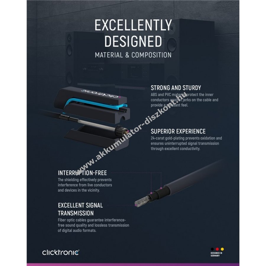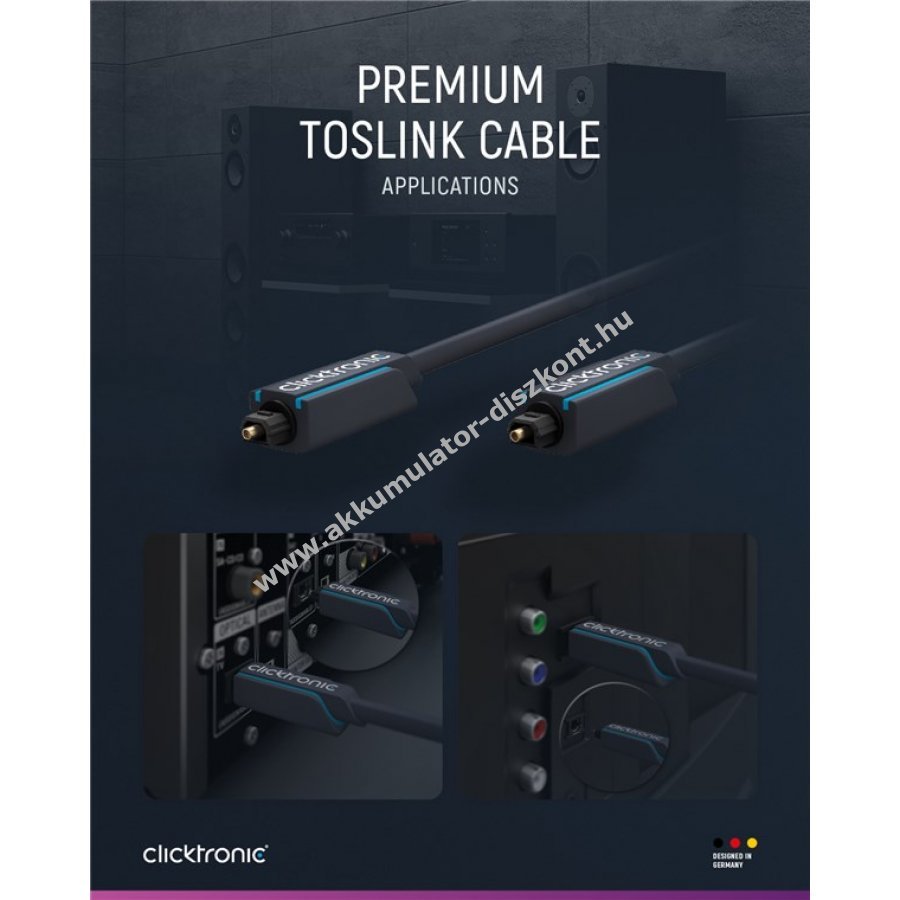 A Clicktronic Toslink kábel tartósságra és stabilitásra készült 10 év garanciával. A háromrészes PVC és ABS csatlakozó szerkezet megvédi a kábelt a hirtelen húzástól és töréstől. A nemesített fém érintkezők és polímer fényvezető a digitális optikai hangjelet maximális minőségben továbbítják. Ideális otthoni szórakoztató rendszerekhez modern audiokomponensekkel.