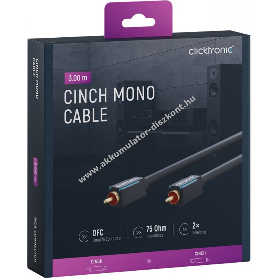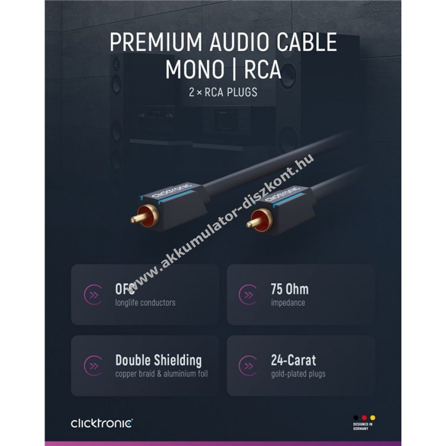 Clicktronic mono Cinch kábel prémium kivitelben, 10 év garanciával. A háromrészes PVC- és ABS-alkatrészekből álló csatlakozóház csillapítja a hirtelen meghúzás okozta terhelést, így védi a kábelt a töréstől. A magas minőségű, aranyozott érintkezők és a 99,9% oxigénmentes réz (OFC) vezetők biztosítják a kristálytiszta hangátvitelt.