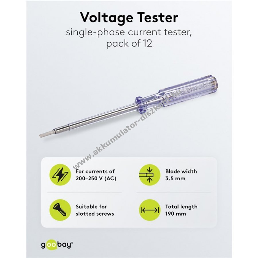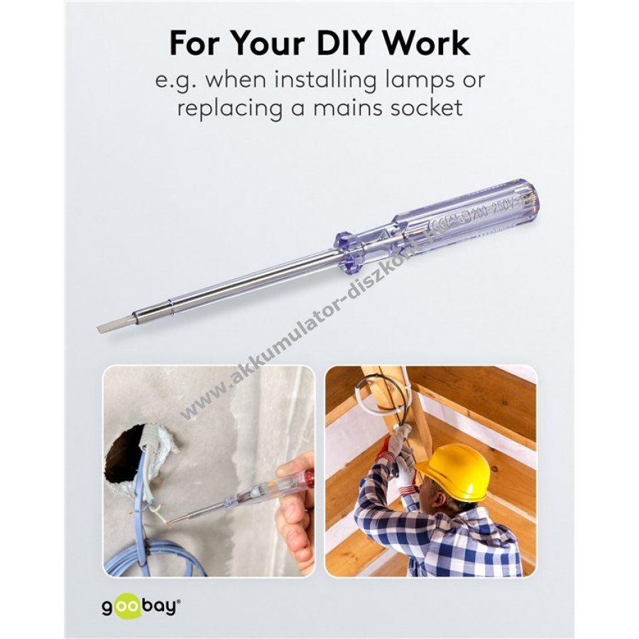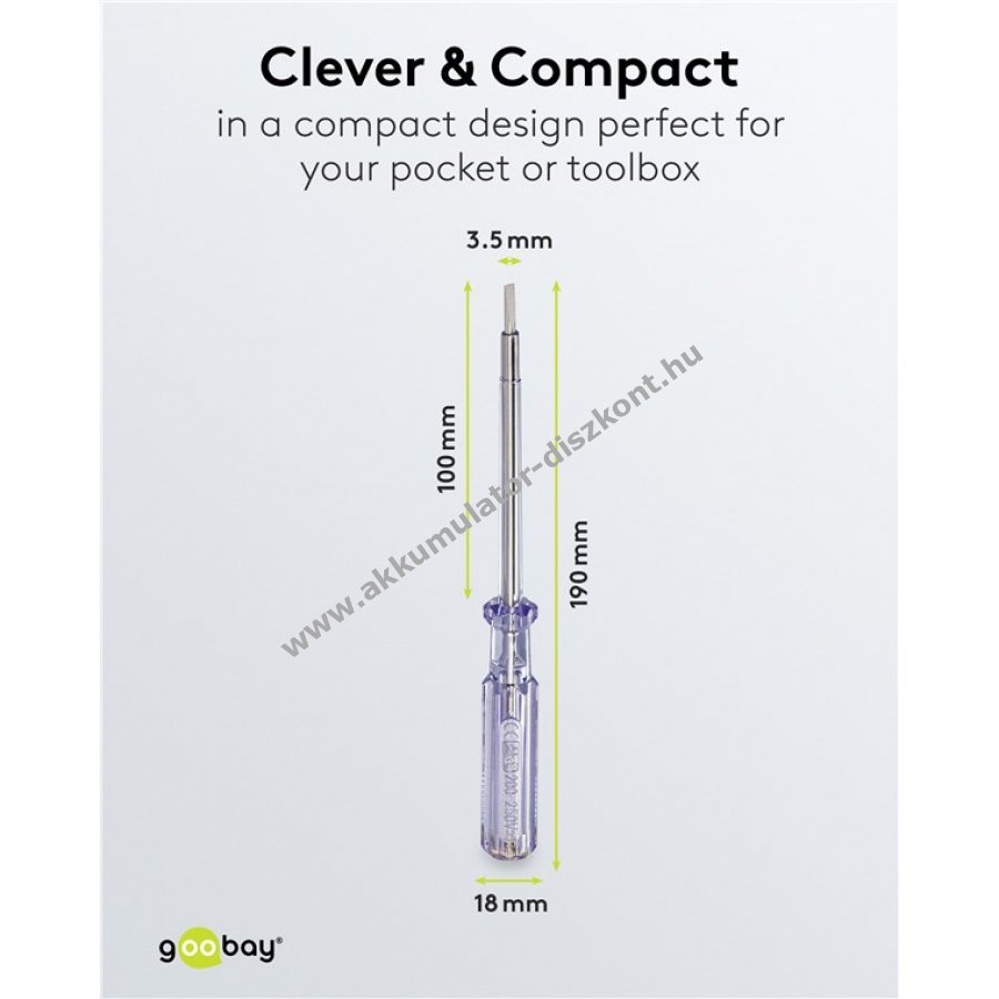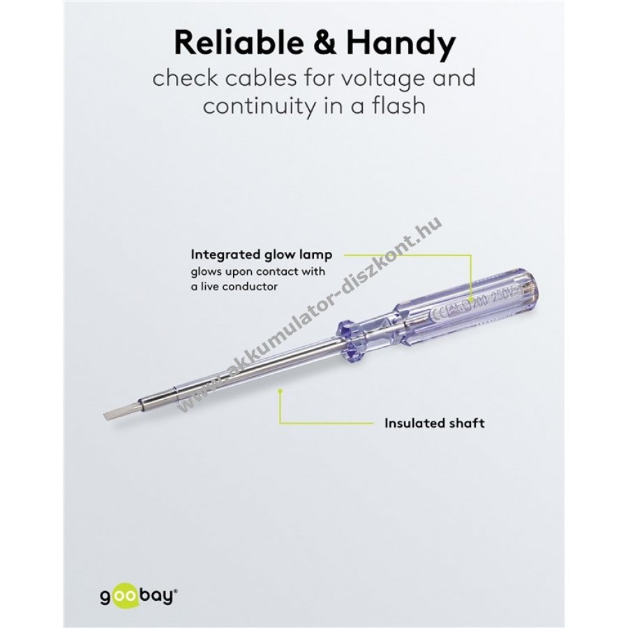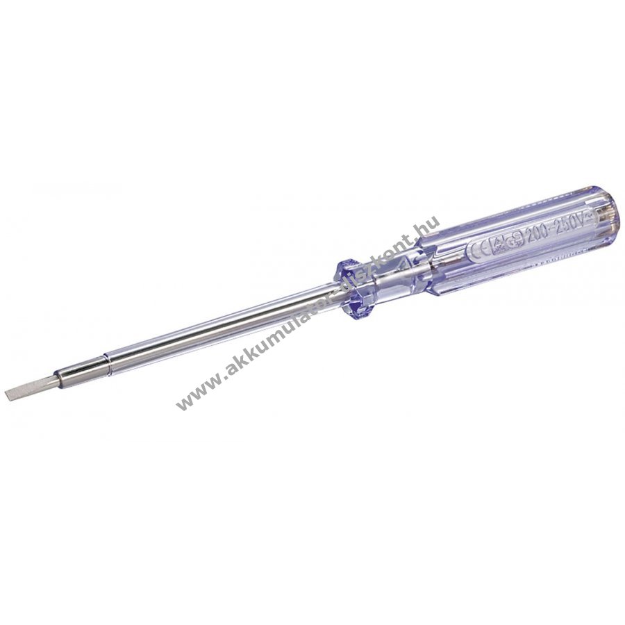 Gyors és egyszerű feszültségellenőrzés elektromos csatlakozásoknál beépített jelzőizzóval amely világít áram alatt lévő vezető érintésekor egyfázisú váltóáram mérés 200 V és 250 V között szigetelt nyél a biztonságos használathoz késtok szélessége 3,5 mm és nyélhossz 100 mm használható csavarhúzóként is
