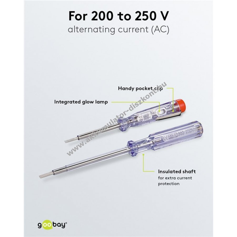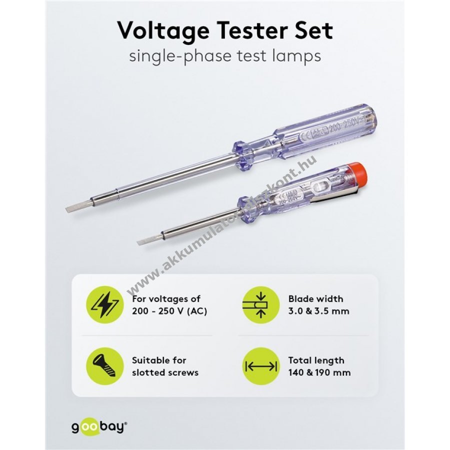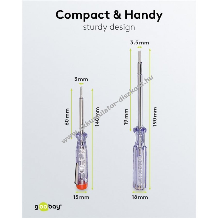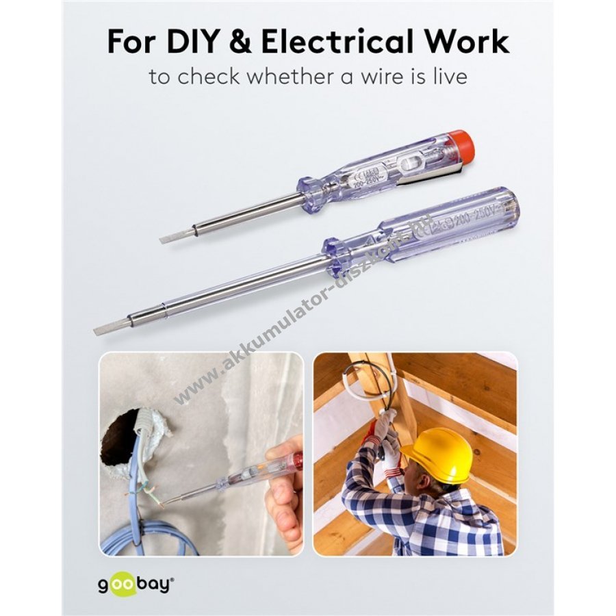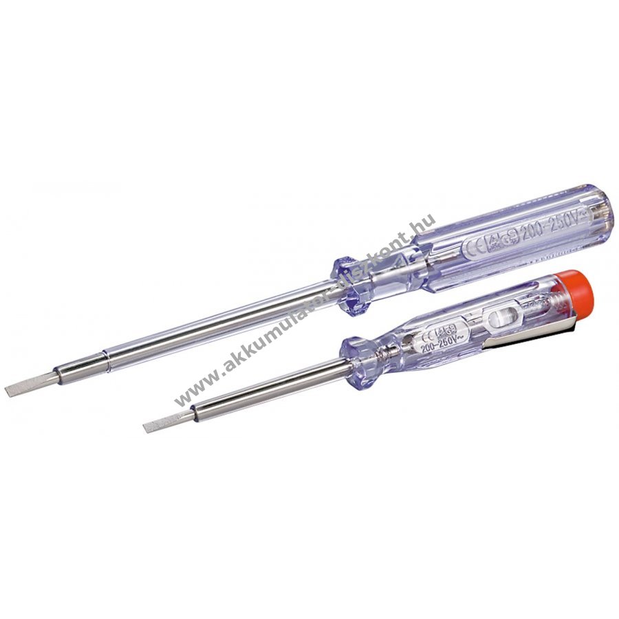 Könnyen használható feszültségvizsgáló készlet elektromos csatlakozások gyors ellenőrzésére. Integrált neonizzó világít, ha áram alatt lévő vezetővel érintkezik. 2 darab egyfázisú feszültségvizsgáló szigetelt nyéllel 200V és 250V közötti váltóáramhoz.