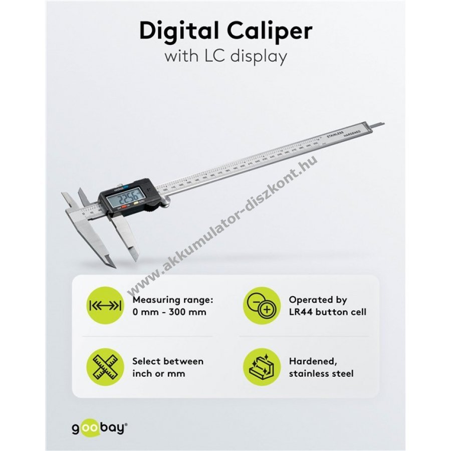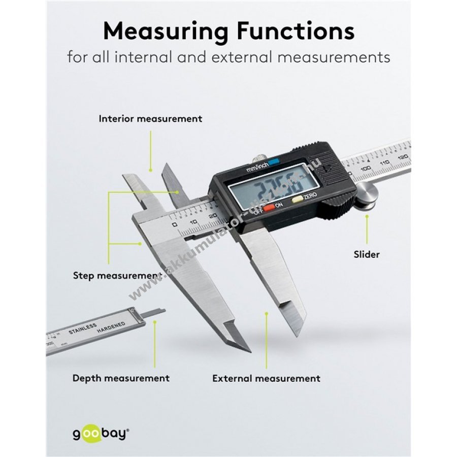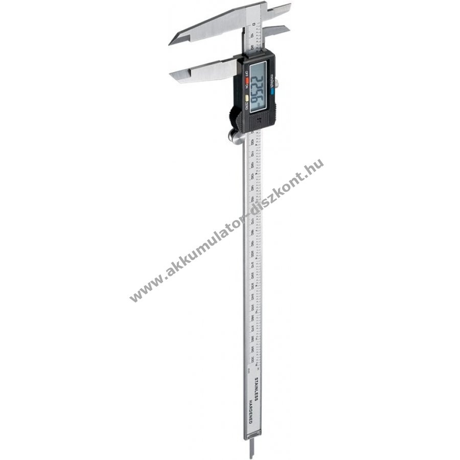 A mérőeszköz 300 mm-ig méri a külső, belső, mélység- és lépésméreteket.