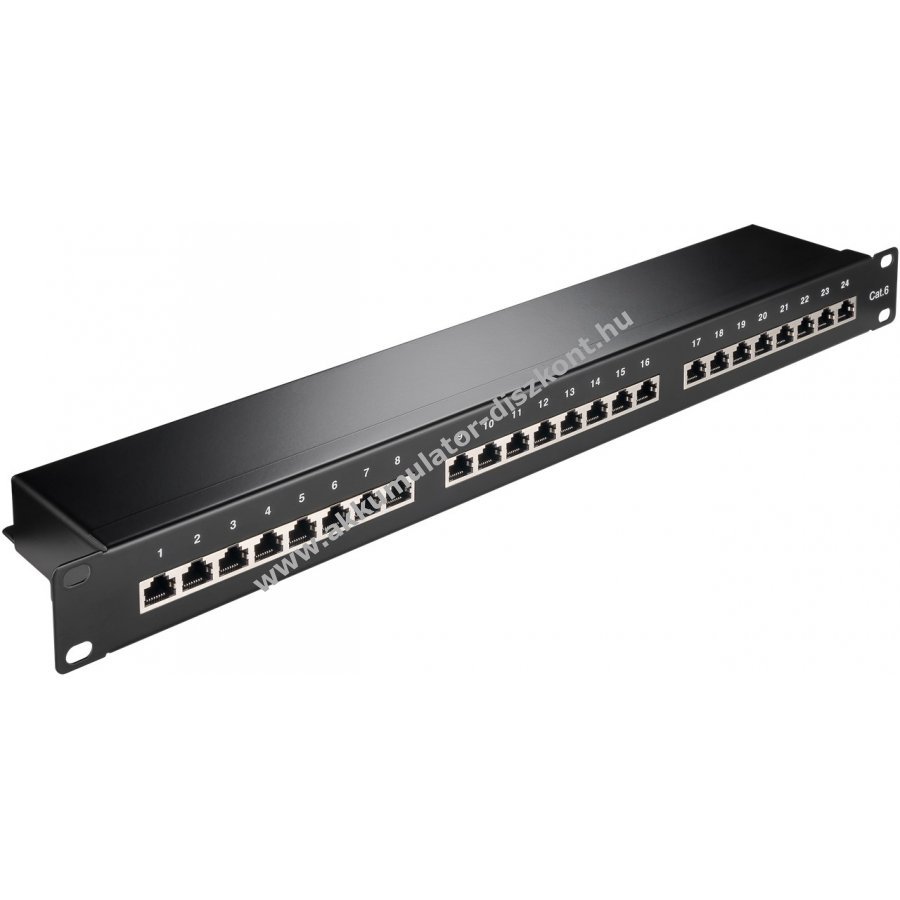 Robusztus fém ház szűrt csatlakozókkal a kiváló kapcsolatért 24 RJ45 port CAT-6 hálózati kábelekhez 19 hüvelykes (48,3 cm) rackbe szerelhető kivitel csavarokkal 0,64 mm kábelátmérőig (AWG 22-26) Szerszámmentes LSA szerelés hegesztés vagy csavarozás nélkül Számozott portok a rendezett kábelkezeléshez Színkódolt csatlakozófelületek TIA 568 A/B szabvány szerint