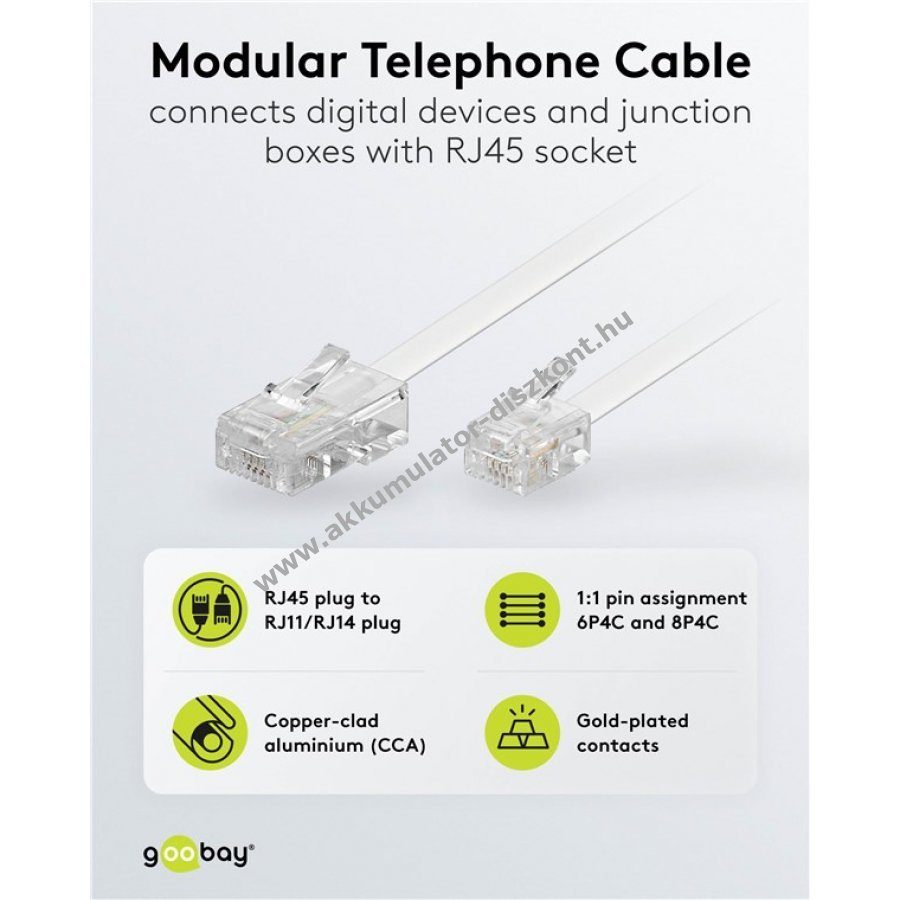 Goobay telefonkábel kiváló jelátvitelhez és stabil kapcsolat biztosításához. Magas minőségű belső vezetők és masszív kábelburkolat garantálják a megbízhatóságot. Alkalmas digitális eszközök és RJ45 aljzatok közötti csatlakozáshoz. Egyszerűen használható DSL modem és DSL splitter összekötésére. Univerzális lapos kábel (2,2 x 4,7 mm) modemhez, routerhez, DSL-hez, VDSL-hez, ISDN-hez és internethez. 1x RJ45 moduláris csatlakozó és 1x RJ11 csatlakozó reteszeléssel és aranyozott érintkezőkkel. Telefonkábel cink-szén helyett magas minőségű, cinkkel bevont alumínium vezetővel a tiszta jelátvitelért. Szabványos 1:1 bekötésű Western csatlakozók (8P4C és 6P4C). Moduláris kábel nem alkalmas analóg készülékek ISDN hálózatra vagy ISDN eszközök analóg vonalra történő csatlakoztatására.