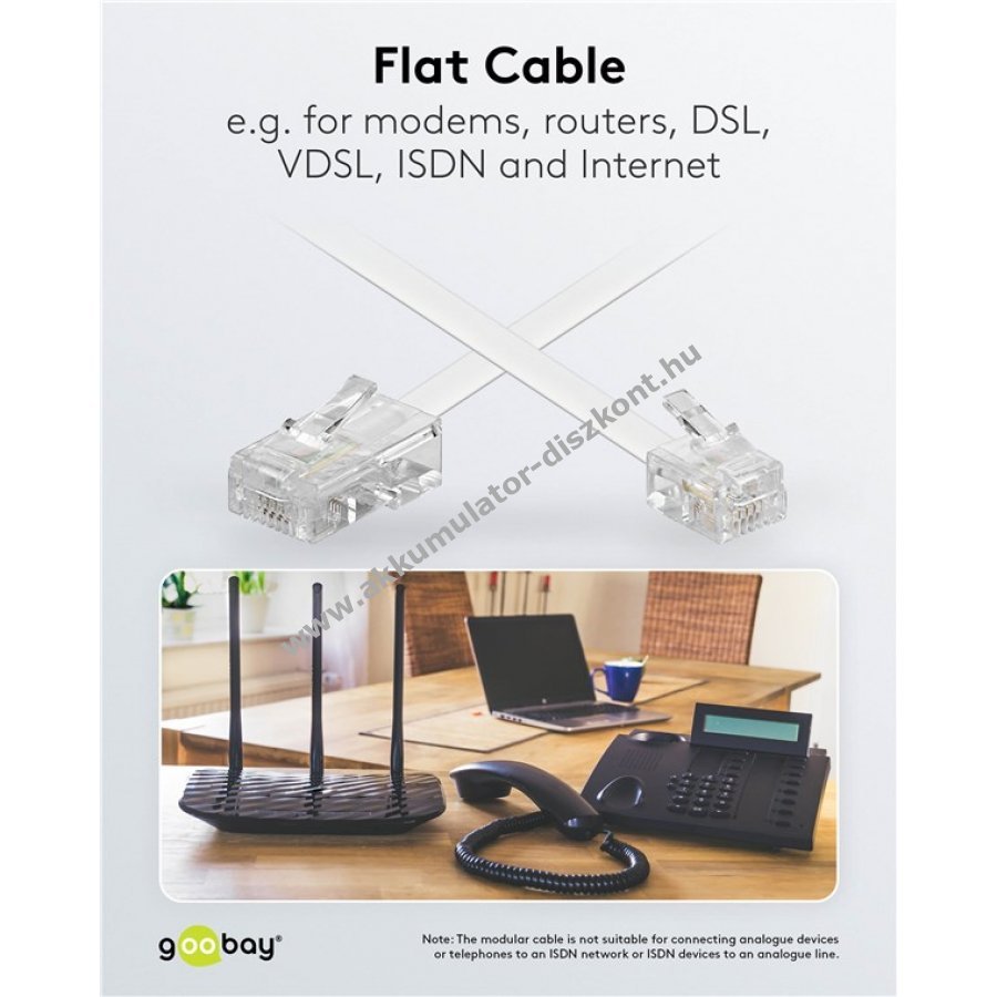Goobay telefonkábel kiváló jelátvitelt és stabil kapcsolatot biztosít digitális eszközök és RJ45 csatlakozók között. A kábel minőségi, kupferkasírozott alumínium vezetővel és aranyozott nikkelezett érintkezőkkel rendelkezik. 3 m hosszú lapos kábel (2,2 x 4,7 mm) univerzálisan használható modemhez, routerhez, DSL-hez, VDSL-hez, ISDN-hez és internethez.