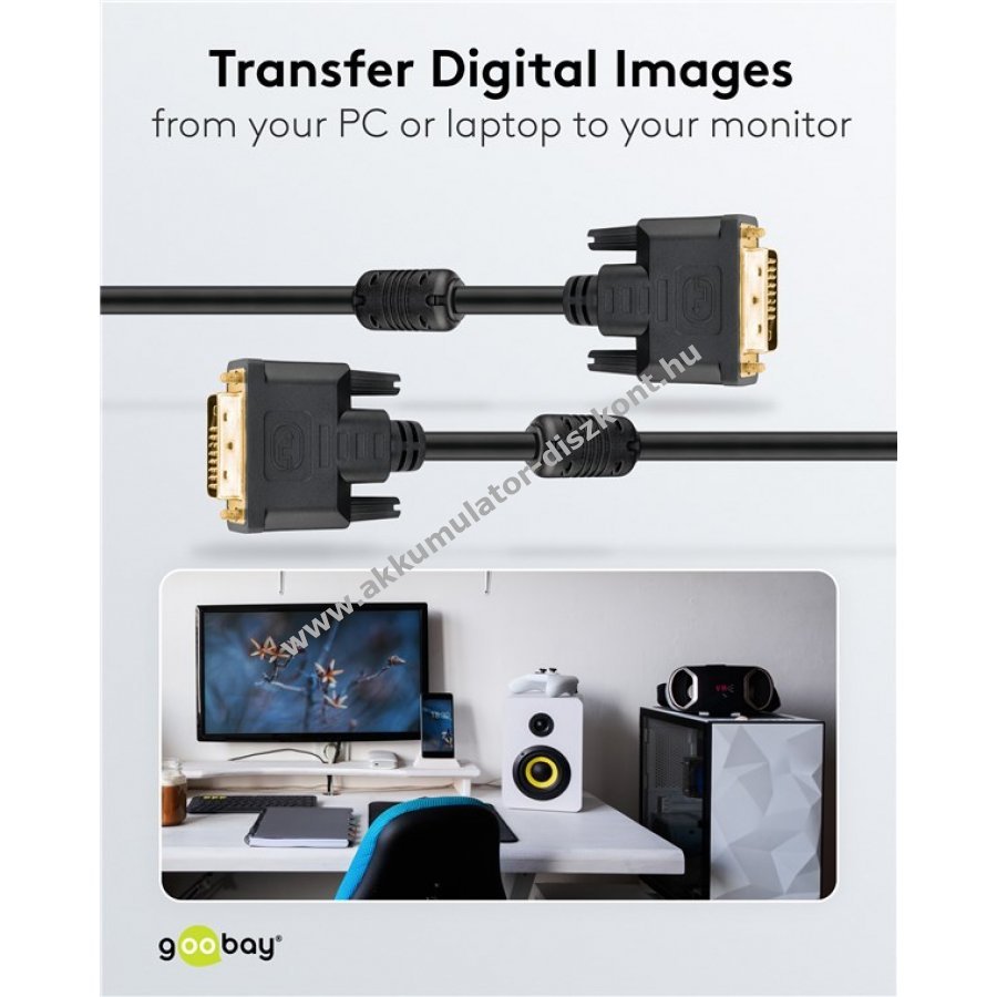 Goobay DVI-D kábel Dual Link (24+1 tű) digitális képátvitelhez PC-ről monitorra vagy projektorra. Támogatja a Full HD 1080p (1920 x 1080 pixel) és akár WQXGA (2560 x 1600 pixel) felbontásokat. Aranyozott korrózióálló DVI-D csatlakozók hosszú távú kiváló vezetőképességgel. Ferritmagok mindkét oldalon csökkentik az elektromágneses interferenciát. 2 m hosszúság ideális rövid távolságok áthidalására.