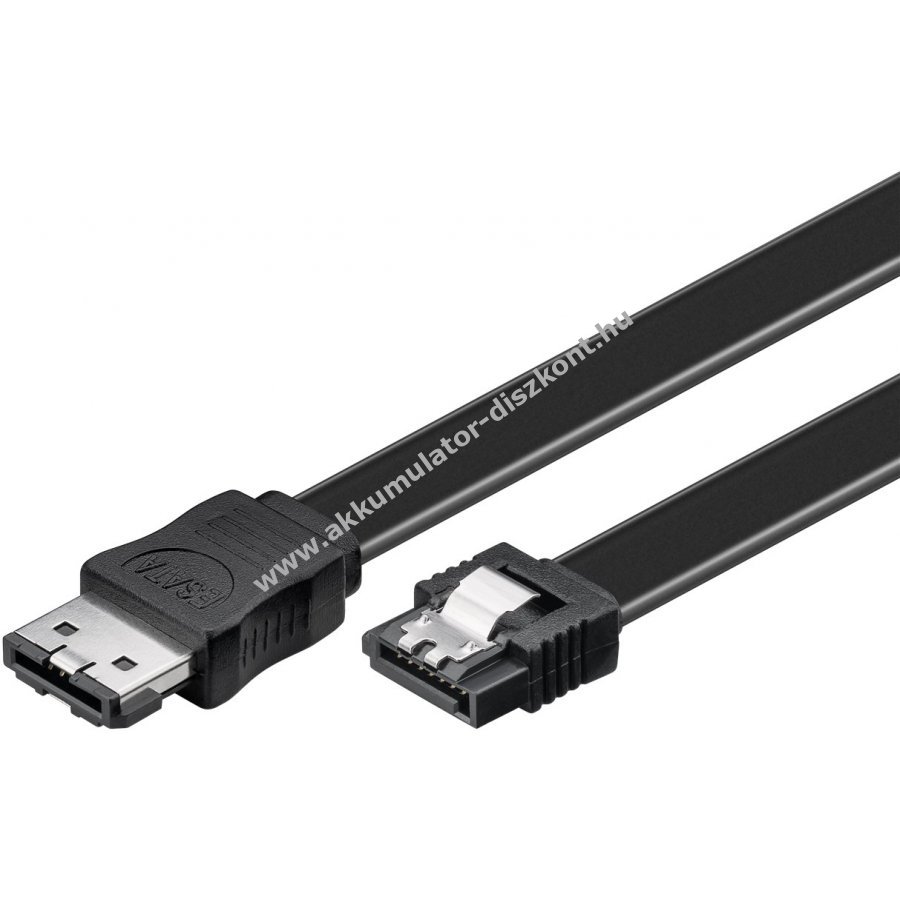 Lapos adatkábel külső SATA merevlemezek PC-hez történő csatlakoztatásához. Ideális adatolvasáshoz merevlemez házba helyezése nélkül. Kompatibilis laptop és asztali gép eSATA csatlakozóival. Támogatja a Serial ATA 1,5 Gbit/s és 3,0 Gbit/s sebességet akár 3 Gbit/s adatátvitellel. Csatlakozók: 1x eSATA I típusú dugó 1x SATA L típusú dugó. Kábelhossz: 0,5 m. Szín: fekete.