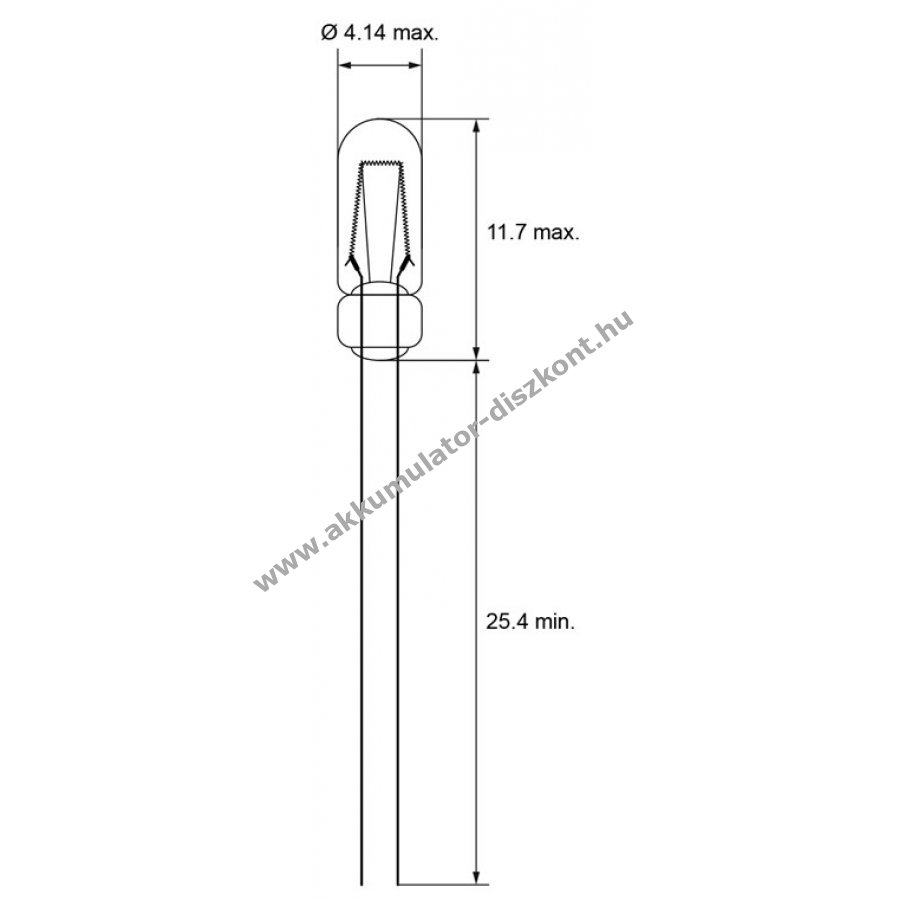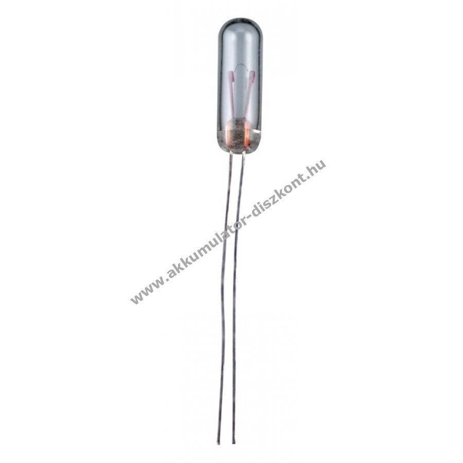 Melegfehér mikró izzó cső formában vezetékes végekkel. Jelzőfényként használható elektronikában és makettekben például vasútmodellekhez. C-2R szál, fejmagasság max 11,7 mm, fejátmérő max 4,14 mm, vezeték hossz min 25,4 mm.