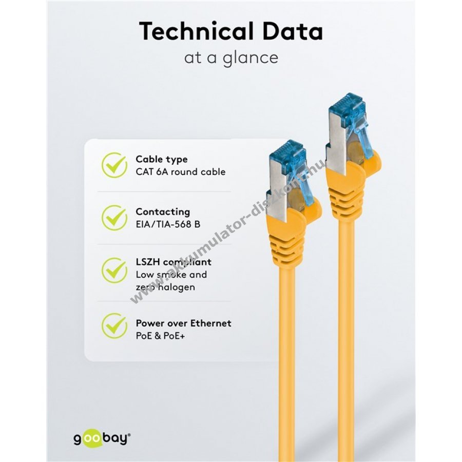A Goobay CAT 6A patchkábel kiváló jelátvitelt biztosít nagy sebességnél és stabil kapcsolatot garantál. Kiváló minőségű rézvezetőkkel és duplán árnyékolt S/FTP kialakítással rendelkezik. Alkalmas 10 Gigabit Ethernet hálózatokhoz és Power over Ethernet (PoE) használatra. Megbízható védelem a törés ellen a hajlításgátló és erős kábelburkolat révén. A rögzítőfül védelme megakadályozza a letörést, így biztosítva a folyamatos internetkapcsolatot. 3µ aranyozott érintkezői kiváló teljesítményt nyújtanak.