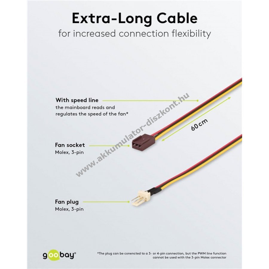 Hosszabbító kábel PC ventilátorok tápellátásához tápegységhez és alaplaphoz. A 3 tűs csatlakozó lehetővé teszi a ventilátor fordulatszámának olvasását és szabályozását az alaplapon. Kompatibilis 3 vagy 4 tűs csatlakozóval, PWM funkció nem támogatott. 1x 3 tűs Molex csatlakozó 1x 3 tűs Molex aljzatra, 1:1 bekötéssel. Extra hosszú 0,6 m kábel nagyobb rugalmasságot biztosít a PC házban való csatlakoztatáskor.