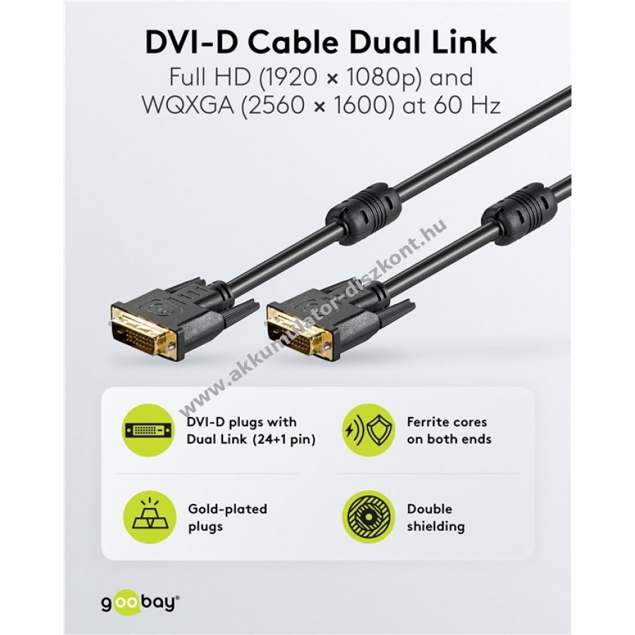 Digitális képátvitel PC-ről monitorra vagy projektorra DVI Dual Link (24+1 tű) csatlakozóval. Alkalmas notebookok, asztali számítógépek, kijelzők, CRT monitorok és projektorok csatlakoztatására. Támogatja a Full HD 1080p (1920 x 1080 pixel) és akár WQXGA (2560 x 1600 pixel) felbontásokat. Aranyozott, korrózióálló csatlakozók hosszú távú megbízhatóságot biztosítanak. Ferritmagok mindkét oldalon csökkentik az elektromágneses interferenciát. 15 m hosszúság ideális nagy távolságok áthidalására.