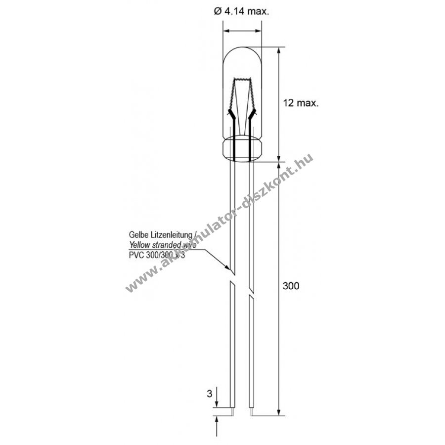 Előre bekötött mini izzó sárga fényű világításhoz elektronikában modellépítés játék és barkács területeken 30 cm hosszú PVC szigetelt kábel csatlakoztatásához alkalmas meleg fehér fényű C-2F filamentszálas kis izzó fejmagasság max 12 mm fejátmérő max 4,14 mm vezeték hossza 300 mm nyitott kábelvégek 3 mm