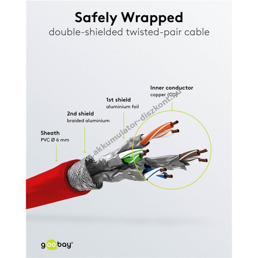 A Goobay CAT 6 patchkábel kiváló jelátvitelt és stabil kapcsolatot biztosít nagy sebességű hálózatokhoz. Kettős árnyékolású S/FTP kialakítású, egyedi árnyékolt sodrott érpárokkal (PiMF) és külső alumínium hálós árnyékolással.