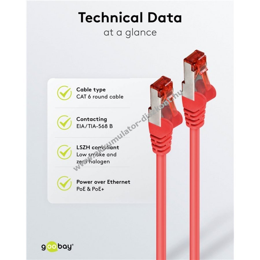 A Goobay CAT 6 patchkábel kiváló jelátvitelt és stabil kapcsolatot biztosít nagy sebességű hálózatokhoz. Kettős árnyékolású S/FTP kialakításával védi a jelet az interferenciáktól. Kiváló minőségű, kupferkaschierter alumínium vezetővel és aranyozott érintkezőkkel rendelkezik a megbízható kapcsolat érdekében. Strapabíró PVC burkolat és hajlításvédő biztosítja a kábel hosszú élettartamát. A RJ45 csatlakozó reteszvédelme megakadályozza a csatlakozó sérülését. A kábel hossza a hajlításvédőn fel van tüntetve.