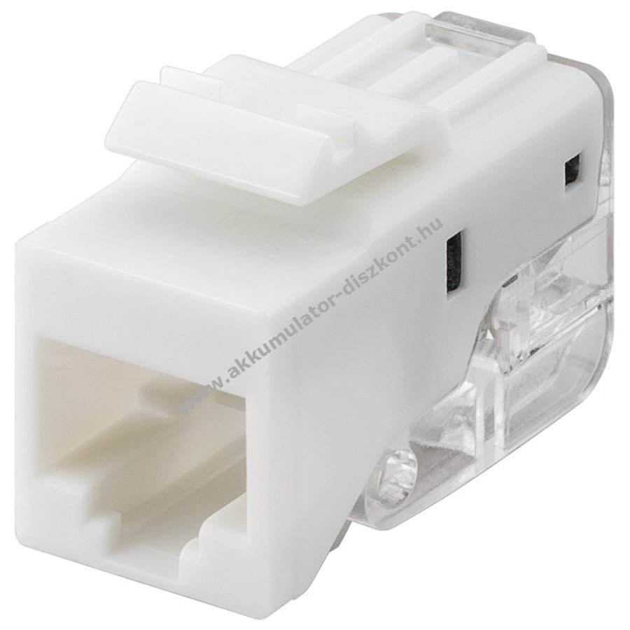 Keystone modul RJ45 aljzat CAT5e UTP 100MHz 8P8C 18,11mm széles Snap-In rendszer, robusztus ABS házzal, PoE+ (IEEE 802.3at) kompatibilis.
