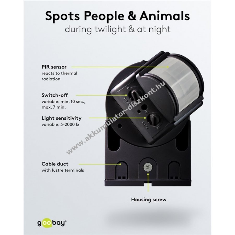 PIR érzékelő emberi és állati mozgásra valamint zajokra reagál és sötétben kapcsolja a világítást.