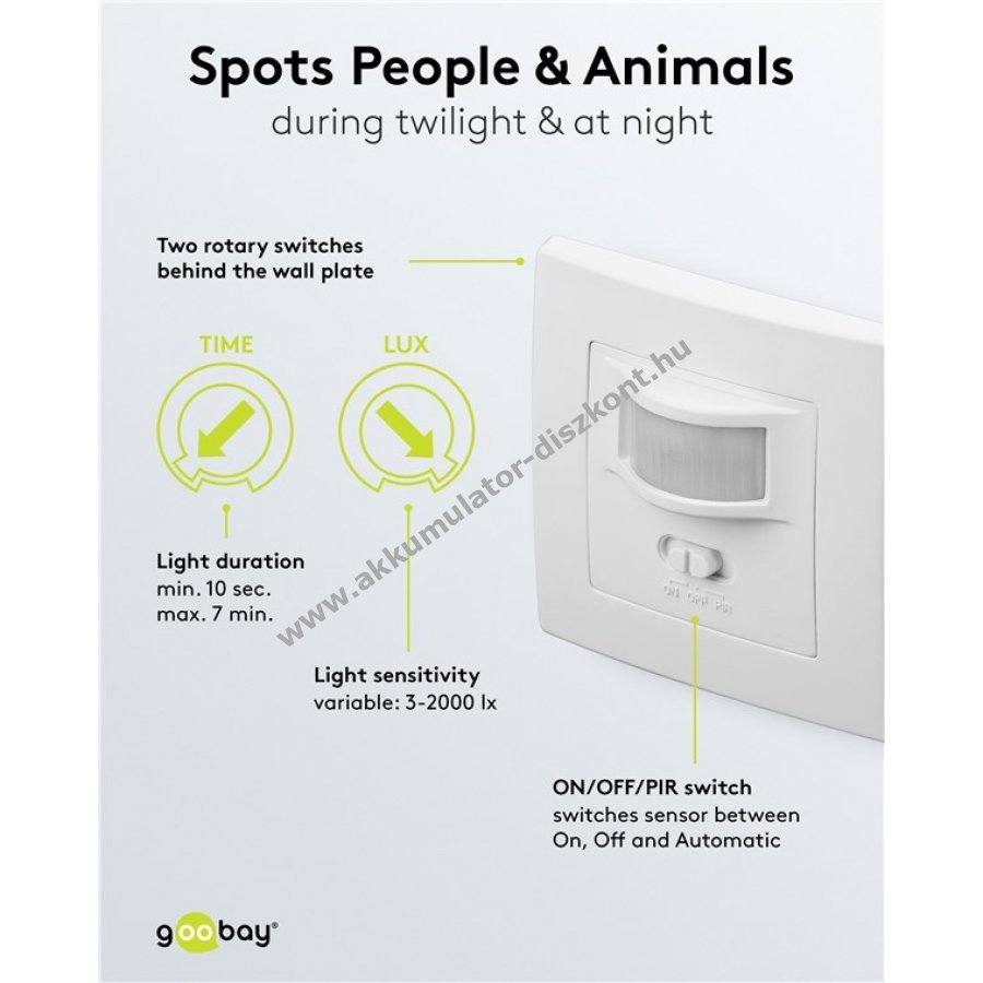 A fényérzékenység (3 lx-től 2000 lx-ig) és a kikapcsolási késleltetés (10 s-től 7 percig) egyszerűen állítható a burkolat mögötti forgatógombbal.