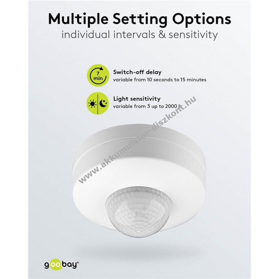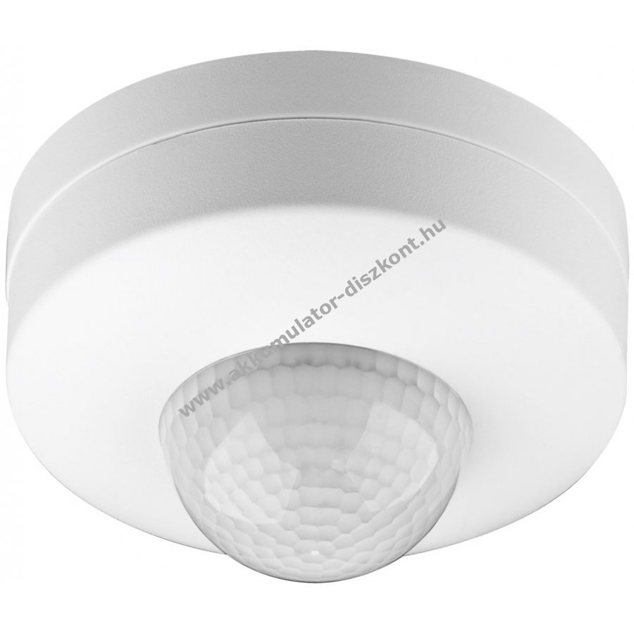 Mozgásérzékelő beltéri használatra IP20 védettséggel amely megakadályozza a botlásokat sötétben és alkonyatkor biztonságérzetet nyújtva. 3 beépített PIR érzékelő emberi és állati mozgásra reagál és sötétben aktiválja a világítást. Kiváló LED világításhoz házautomatizálás vagy biztonsági rendszerek részeként. Érintésmentesen kapcsolja a világítást így ideális olyan helyiségekbe ahol gyakran foglalnak a kezek például folyosók vagy háztartási helyiségek. A fényérzékenység 3 lx és 2000 lx között valamint a kikapcsolási késleltetés 10 s és 15 perc között könnyen állítható forgatógombbal. LED és energiatakarékos lámpákhoz 300 W-ig valamint hagyományos izzókhoz 1200 W-ig használható. 360 fokos látószöge miatt mennyezeti felszerelésre ideális 2,20 m és 4 m közötti telepítési magasságban. Csak beltéri használatra alkalmas.