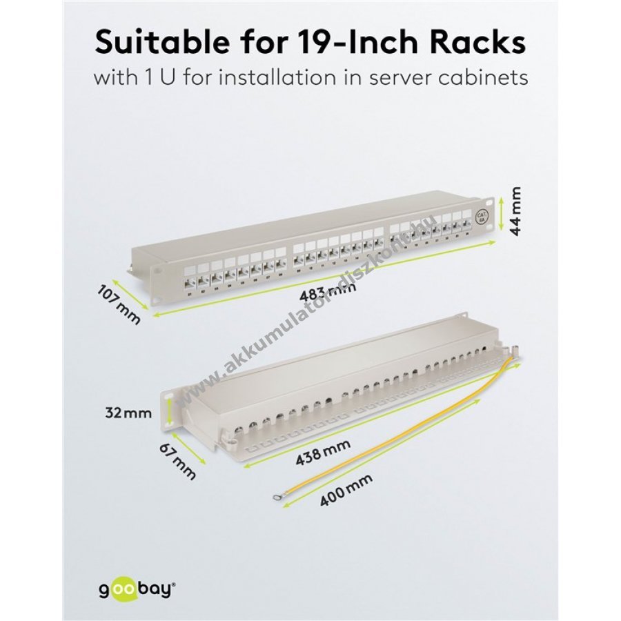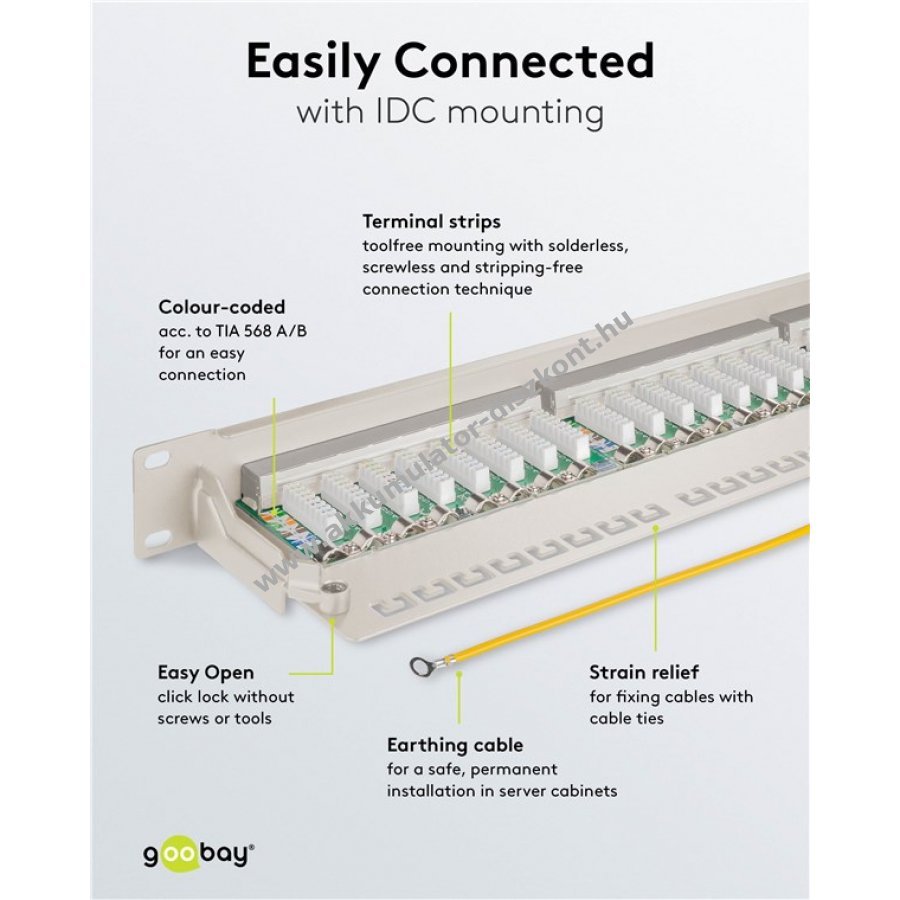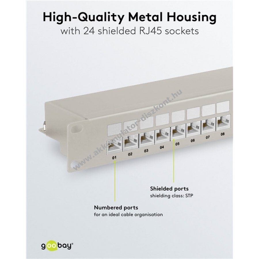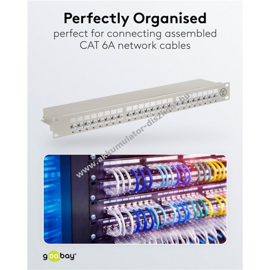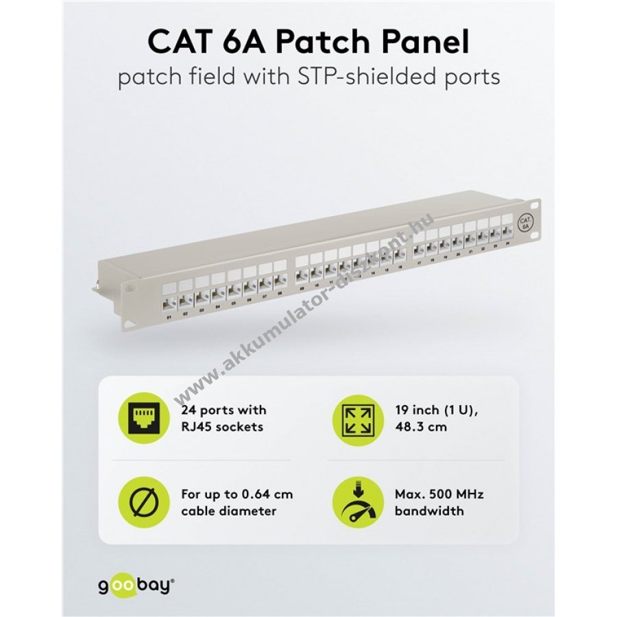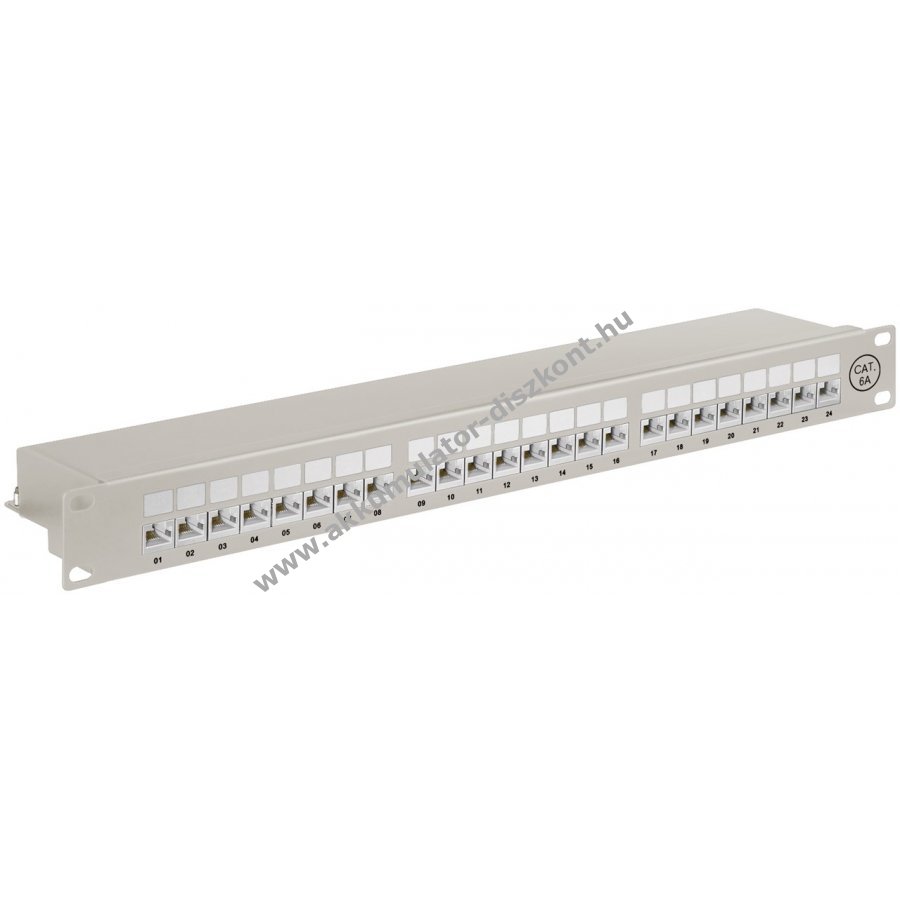 Robusztus fém ház árnyékolt RJ45 portokkal a kiváló kapcsolatért 24 port a CAT-6A hálózati kábelekhez 19 colos méret rackbe vagy szerver szekrénybe szereléshez 0,64 mm kábelátmérő támogatás kézi szerszám nélküli LSA csatlakozás a gyors és egyszerű telepítéshez árnyékolt portok könnyen nyitható kivitelben számozott portok a rendezett kábelkezeléshez színkódolt csatlakozók a TIA 568 A/B szabvány szerint