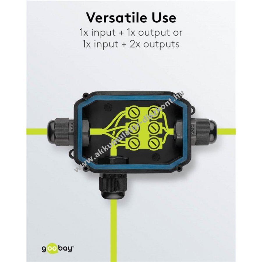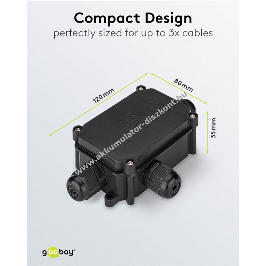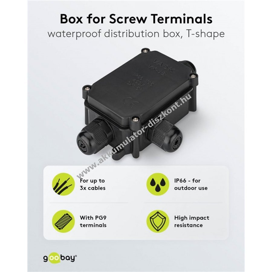 Kültéri és nedves helyiségekben használható IP66 védettségű csatlakozódoboz három kábel biztonságos összekötéséhez. Ideális kültéri világítás, garázs vagy hobbi műhely elektromos csatlakoztatásához.