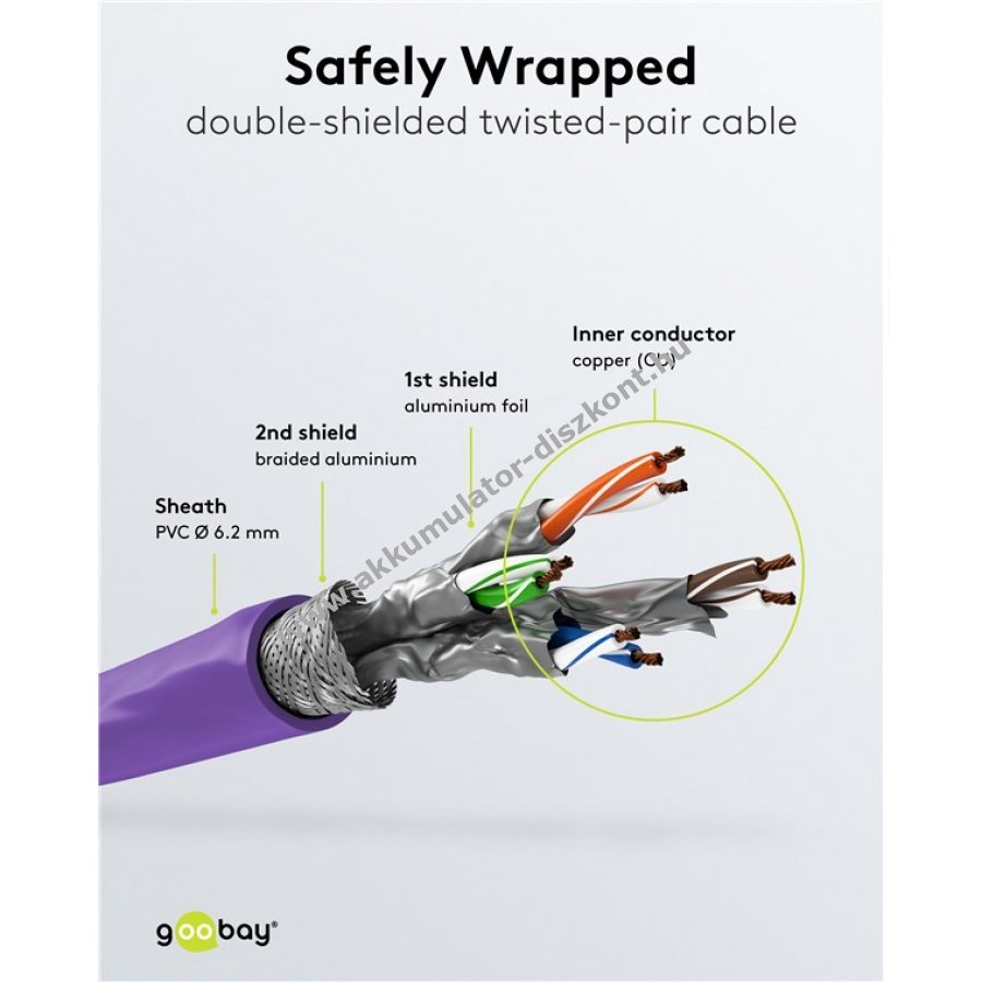 - S/FTP árnyékolás: alumínium fólia a vezetékpárokon és alumínium fonat a kábelburkolaton