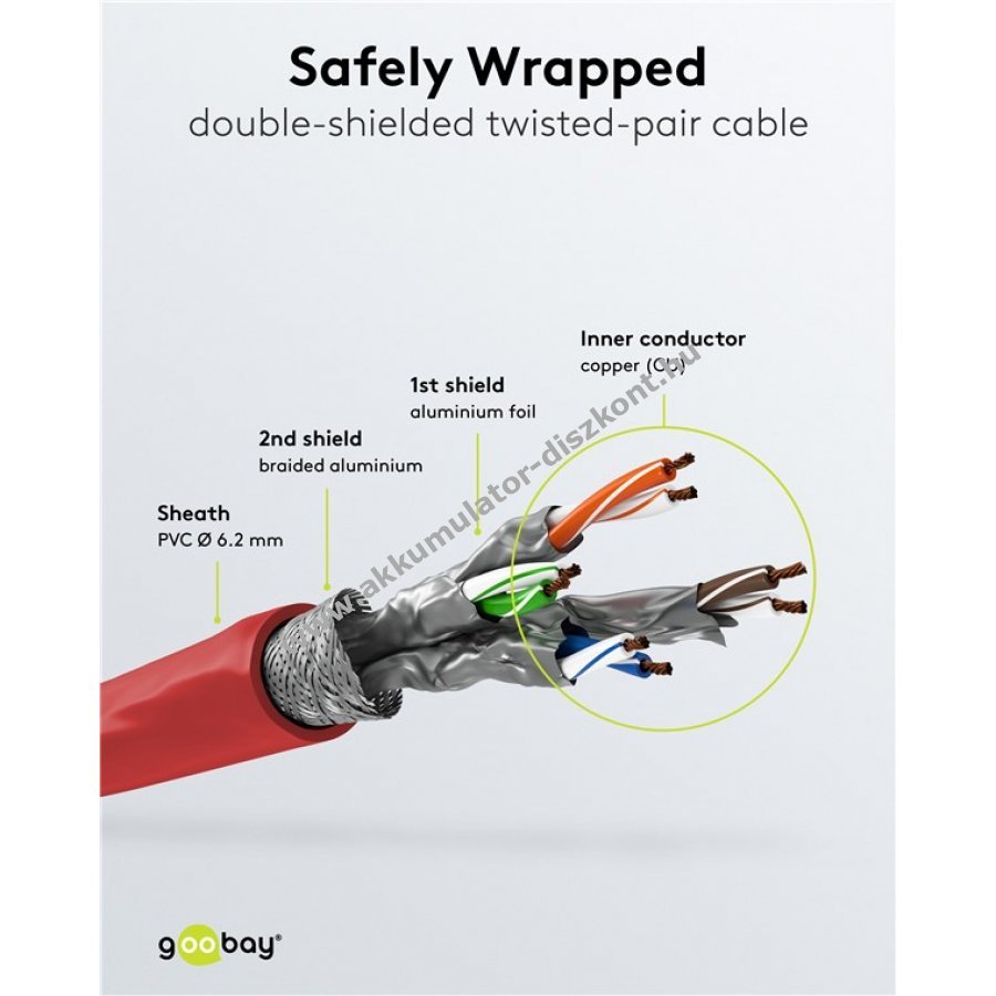 S/FTP árnyékolása alumínium fólia és fonott rézréteg kombinációjából áll ami csökkenti az interferenciát. 50 µm aranyozott érintkezői megbízható jelátvitelt garantálnak.