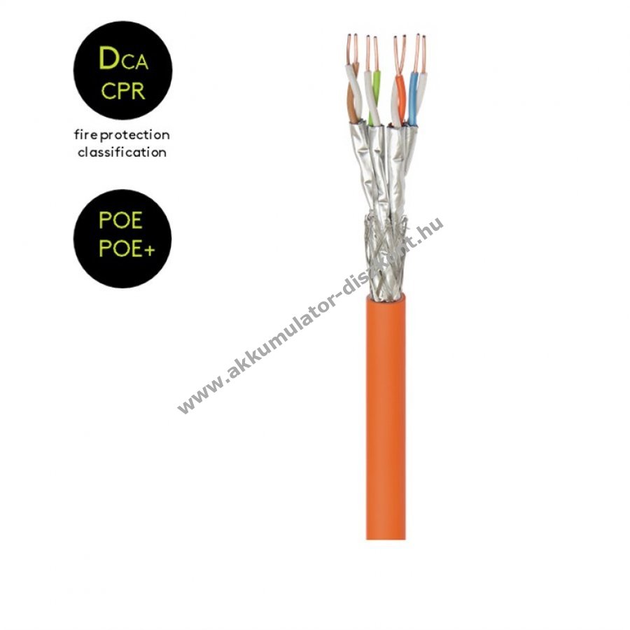 A kábel dupla árnyékolású S/FTP kialakítású alumínium fólia és fonott árnyékolással a vezetékek körül.