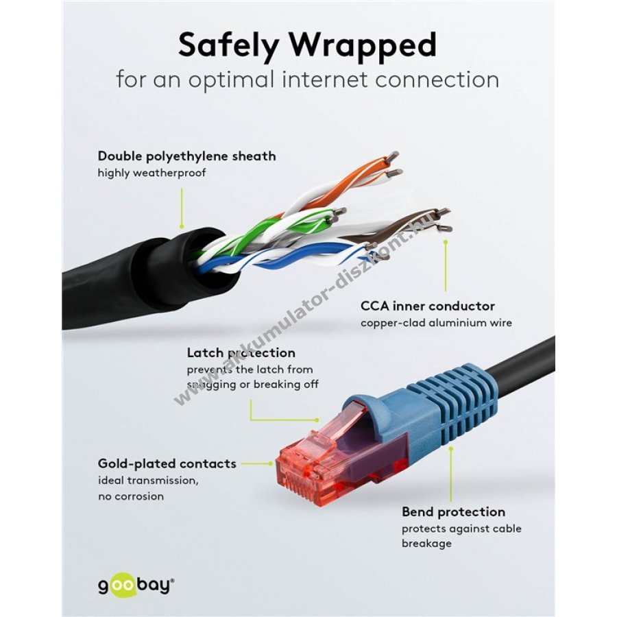 A Goobay CAT 6 kültéri hálózati kábel ideális kültéri használatra kertben kempingezéshez épületfalakon erkélyen és megfigyelő kamerák csatlakoztatásához