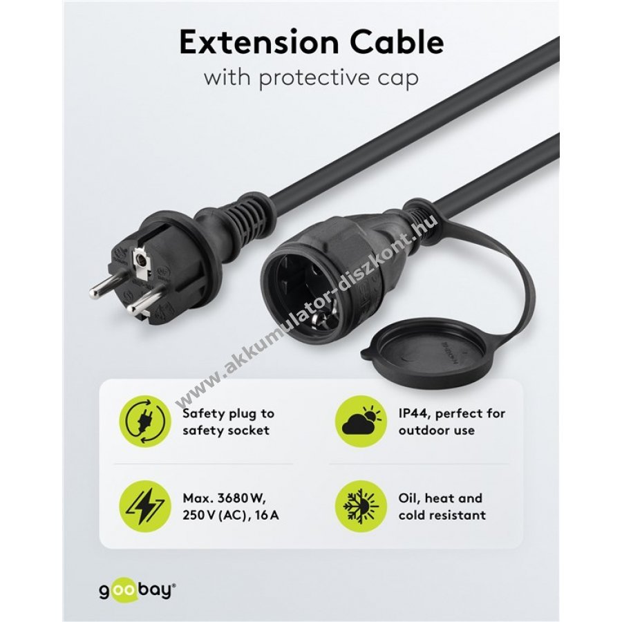 Kültéri és beltéri használatra alkalmas hálózati kábel 25 m hosszban. Tartós gumi külső borítás olaj-, hő- és hidegálló kivitelben. IP44 védelem vízpermet és nedves környezet ellen. Alkalmas háztartási gépek, például porszívó vagy fűnyíró hosszabbítására. VDE és TÜV Rheinland által minősített dugó 16 A, 250 V, 3680 W teljesítményig. A csatlakozó aljzaton védőkupak a por és nedvesség elleni védelemhez. Közepes mechanikai igénybevételre tervezett rugalmas kábel (H07RN-F 3G1,5).